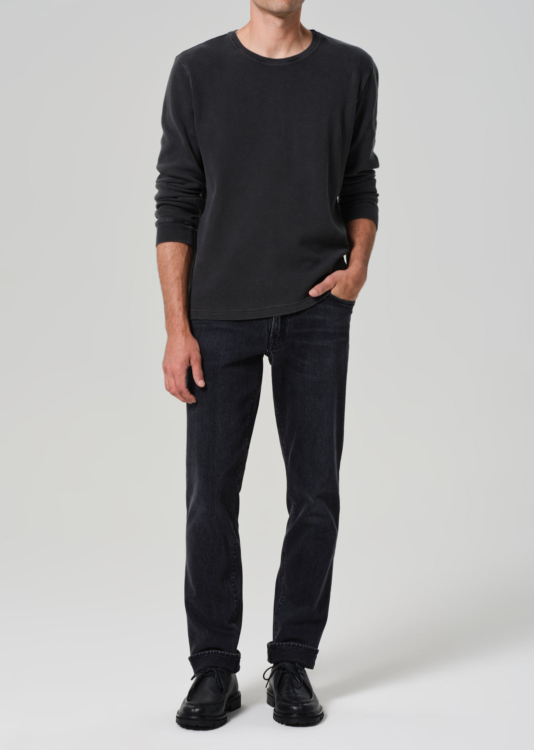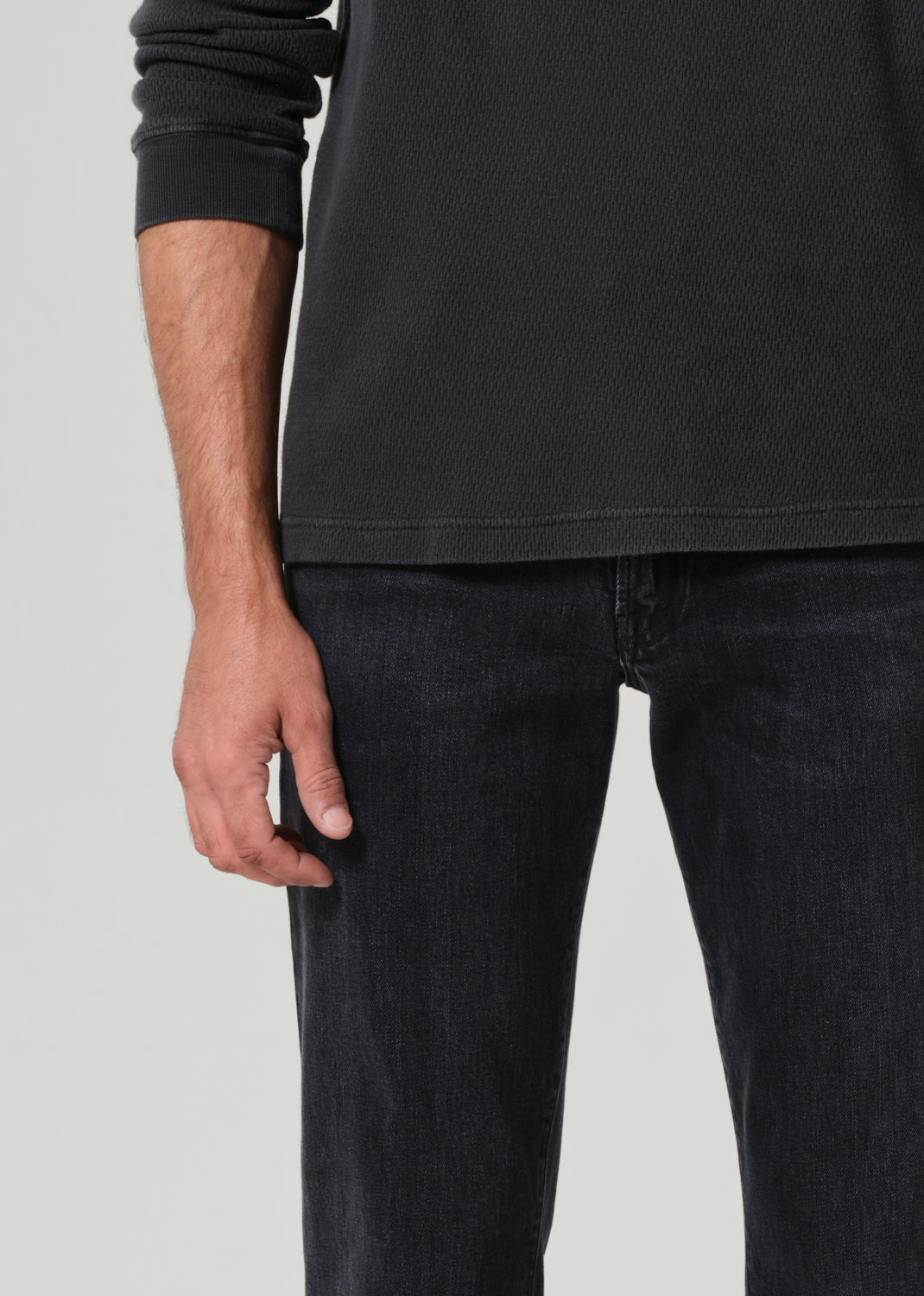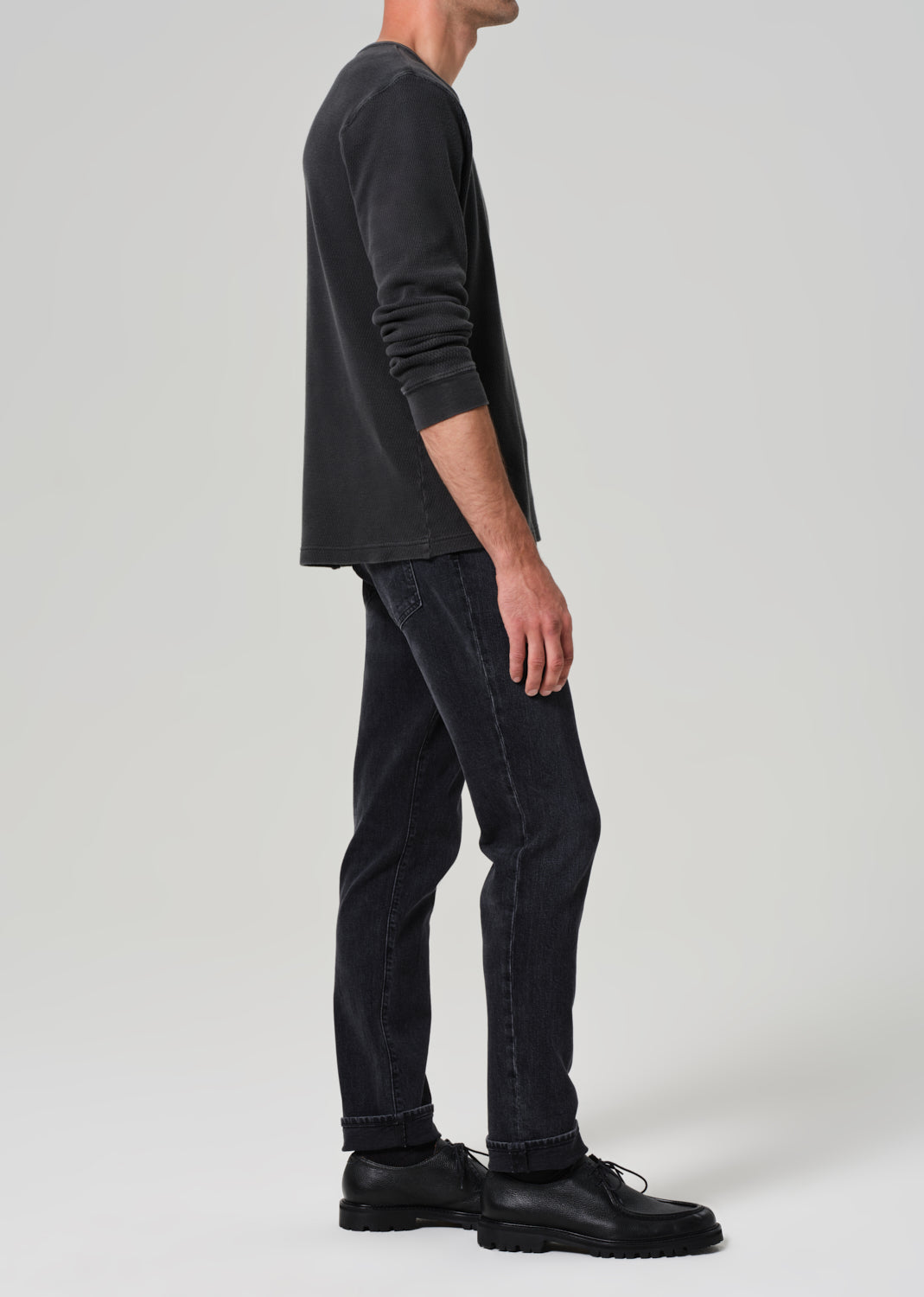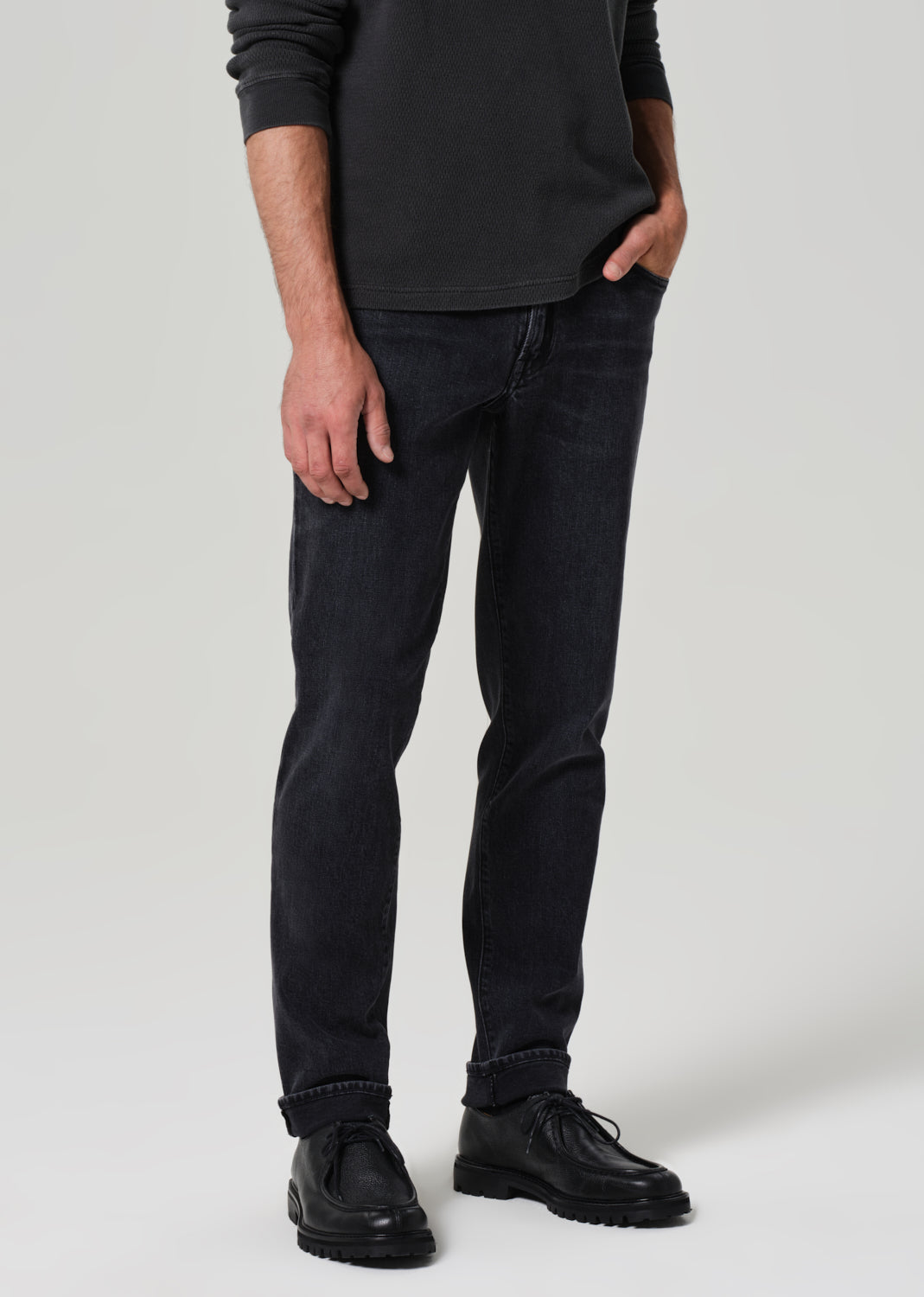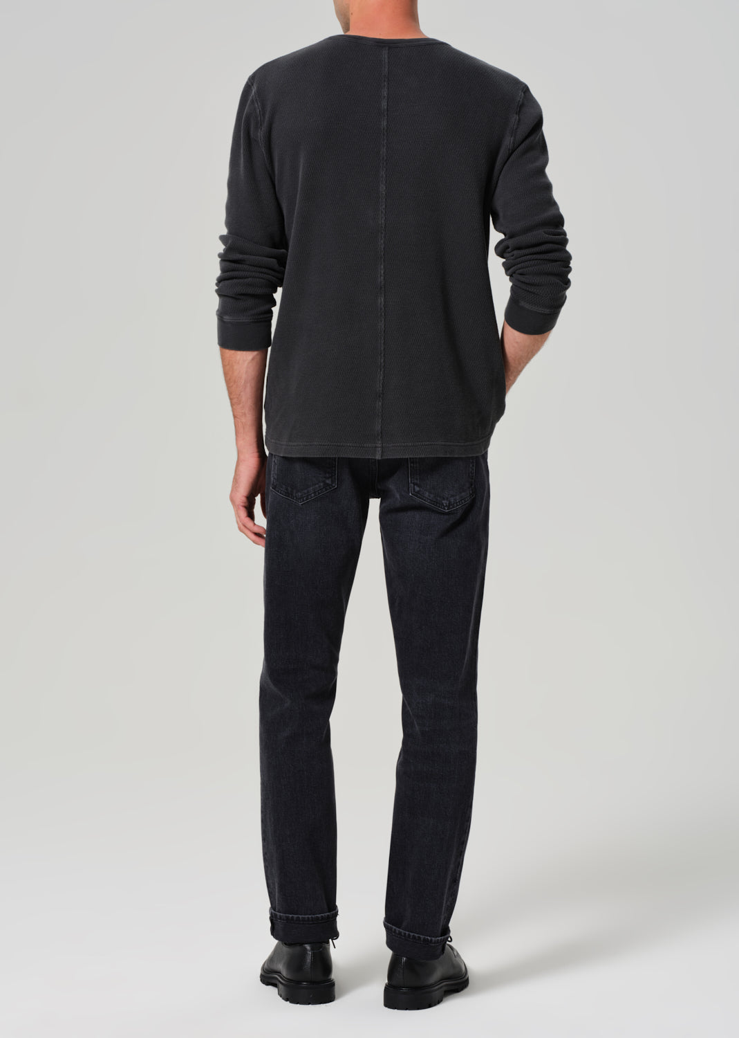 The Adler is our slim straight fit—cut with a slightly higher rise, room through the thigh, and a subtle taper from knee to ankle. Crafted from heavyweight comfort stretch denim with a soft hand, this pair is finished in a marbled black wash with subtle fading and whiskering for a broken-in, lived-with look.