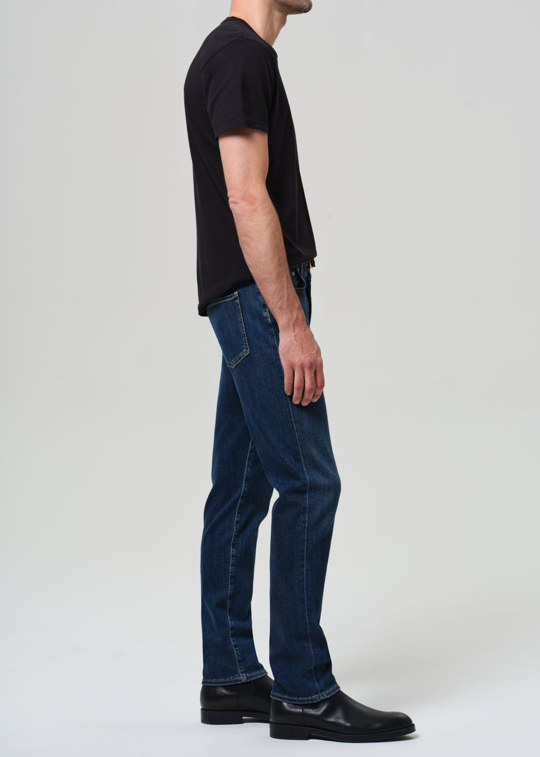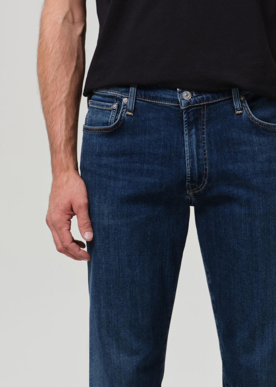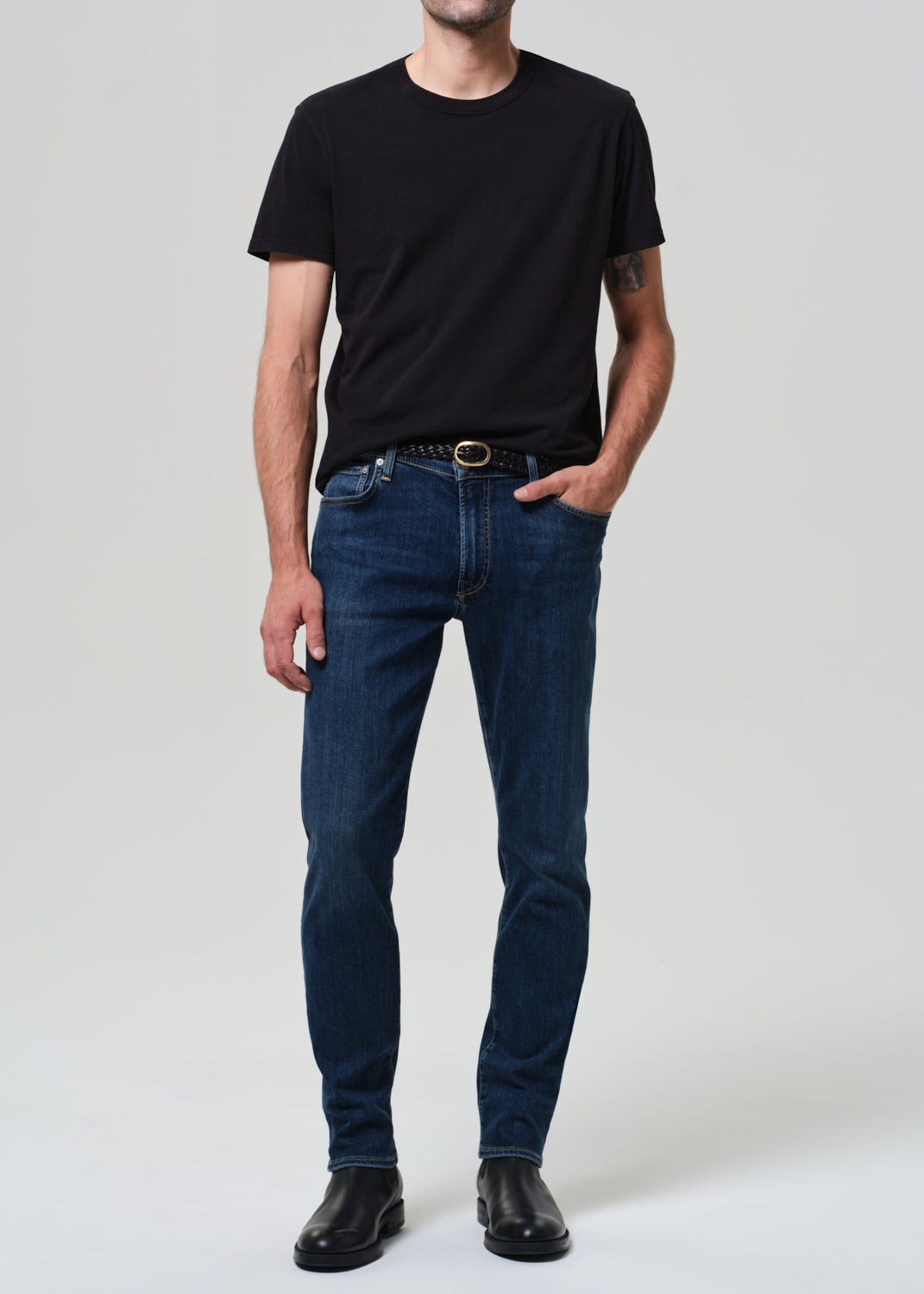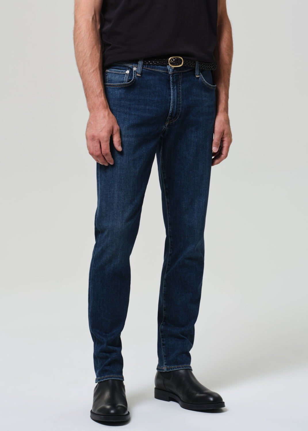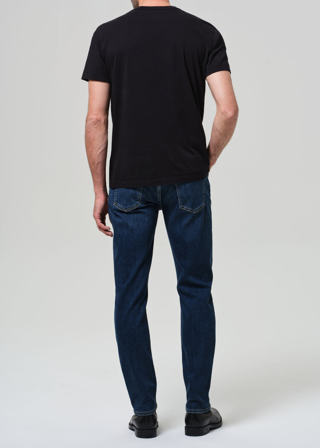 The Adler is our slim straight fit—cut with a slightly higher rise, room through the thigh, and a subtle taper from knee to ankle. This pair is made from lightweight stretch denim crafted with regenerative cotton, offering soft structure and ease of movement. Finished in a dark indigo wash with subtle fading and whiskering for a lived-in look.