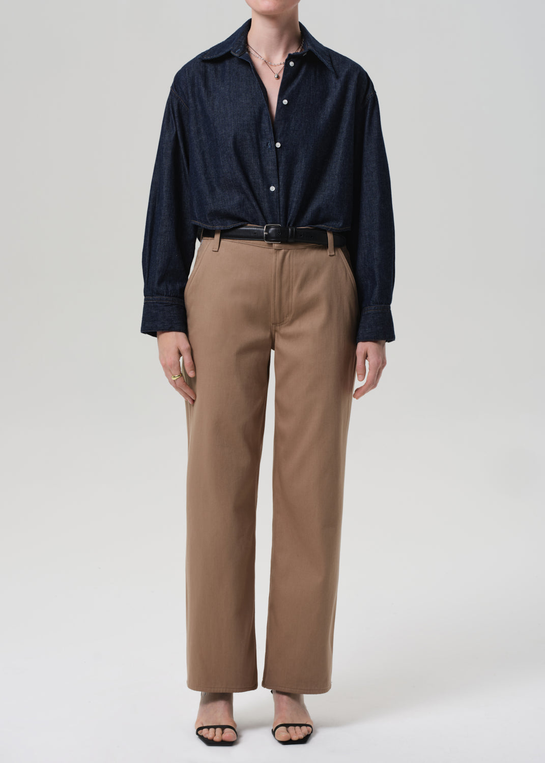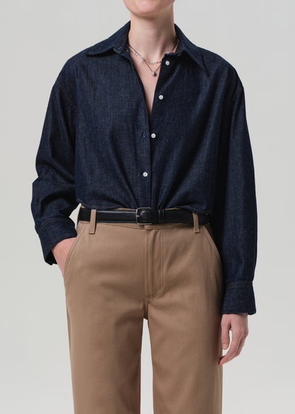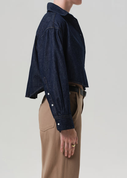 A crisp update to classic shirting, the Ana is reimagined in lightweight Japanese denim with a soft, natural drape. The cropped silhouette and pointed collar lend modern structure, while the deep Piave wash—a rich, dark indigo—keeps the look polished yet relaxed. Pairs well with tonal denim or crisp white trousers.