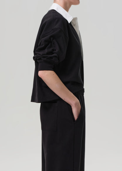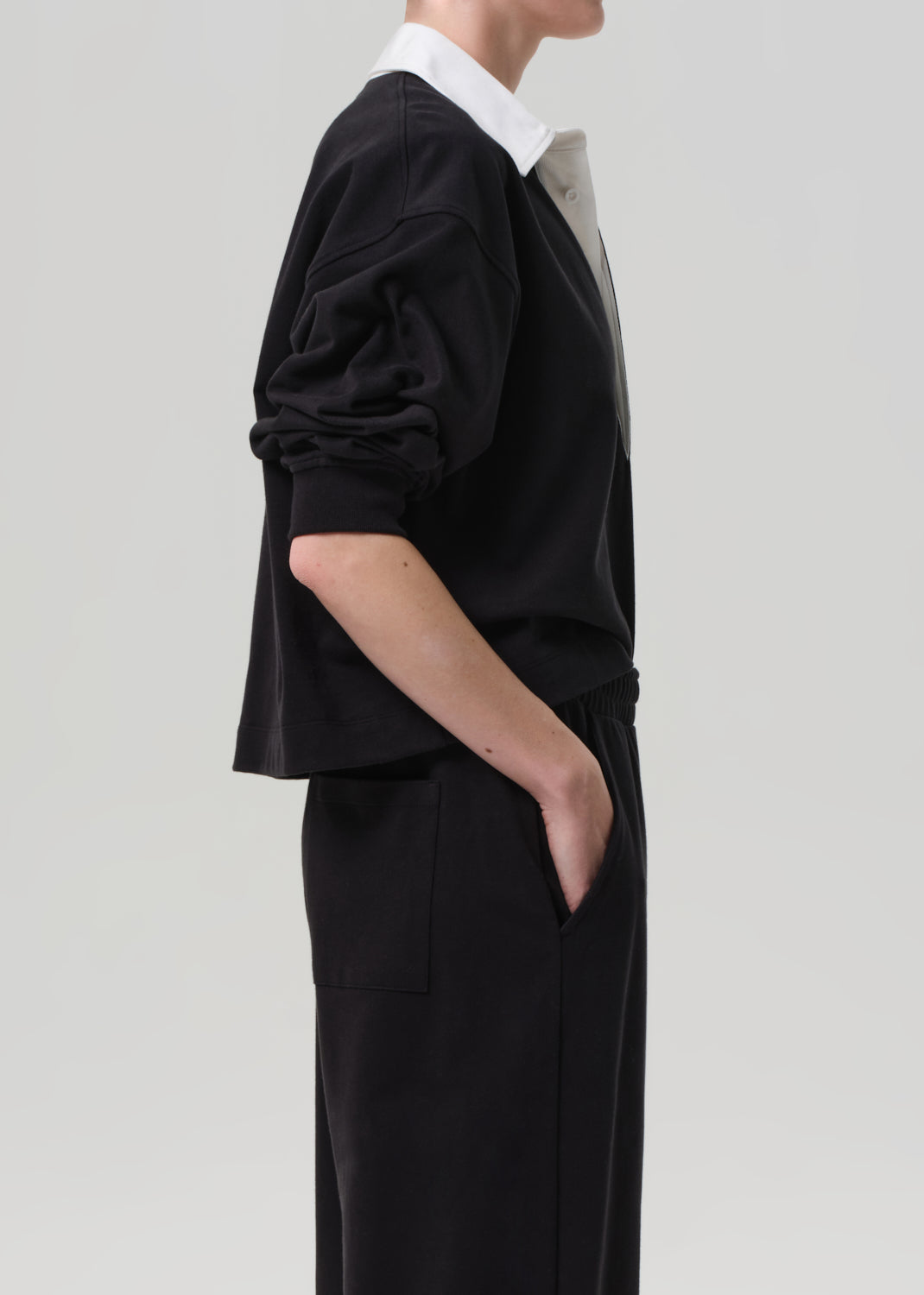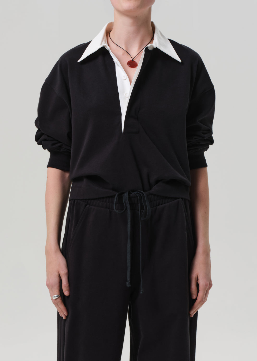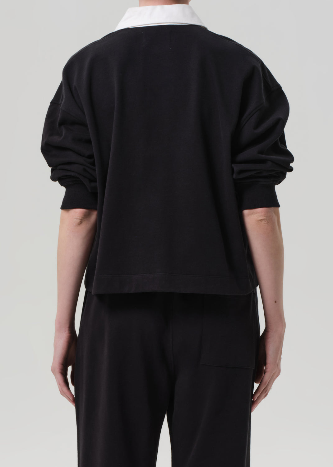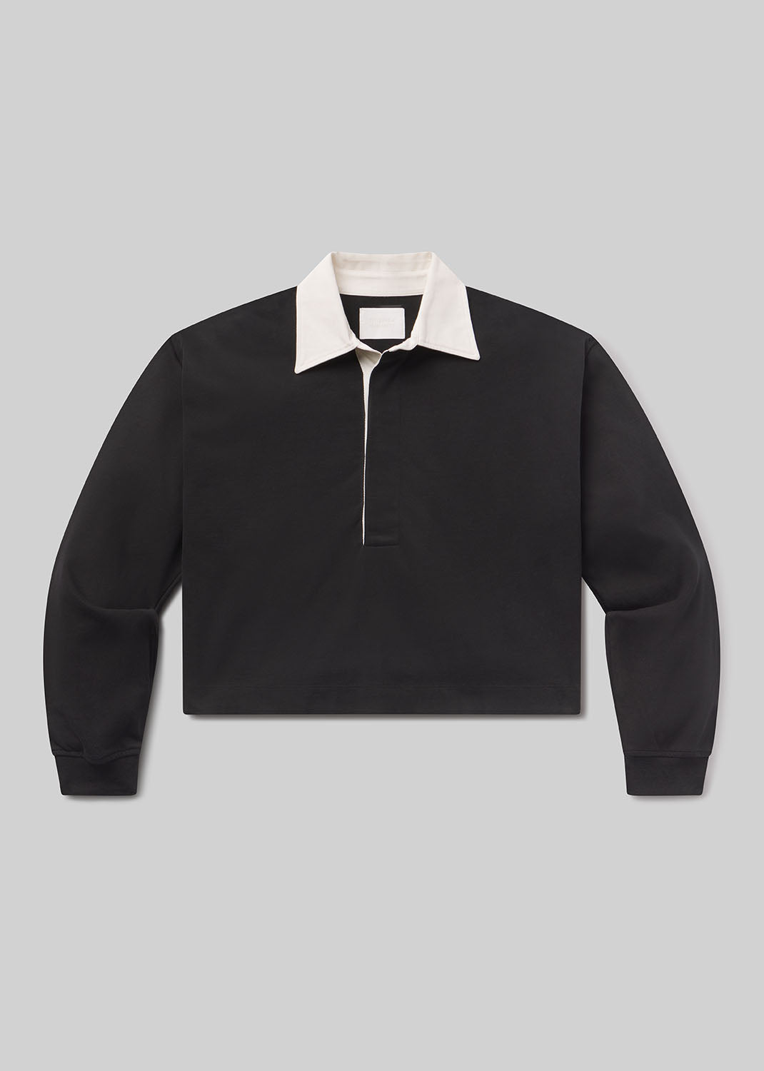 A modern nod to classic sportswear, the Aris Rugby is crafted from luxe cotton with a soft hand. The relaxed silhouette features a true black body and contrasting white collar for a clean, graphic finish. Style it with denim or tailored trousers for an effortless blend of polish and ease.