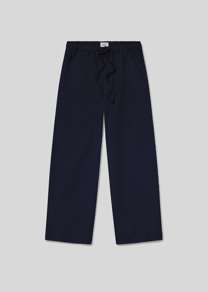 Crafted from a lightweight Italian twill, the ‘Aurora’ pant features a soft cotton with natural drape and breathability. The high-rise drawstring waist and wide leg create a relaxed yet refined silhouette. In deep ‘True Navy,’ it’s an effortless alternative to black—perfect with tonal layers or crisp shirting.