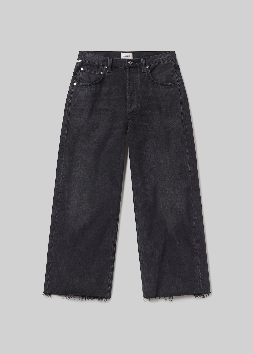 Looks Like: Washed out dark black denim pant with raw hem