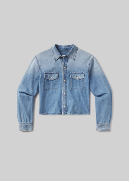 Looks Like: Medium indigo denim blue cropped button front long sleeve shirt with fading