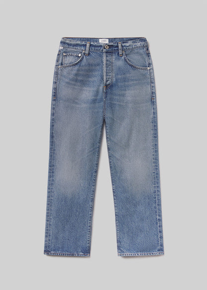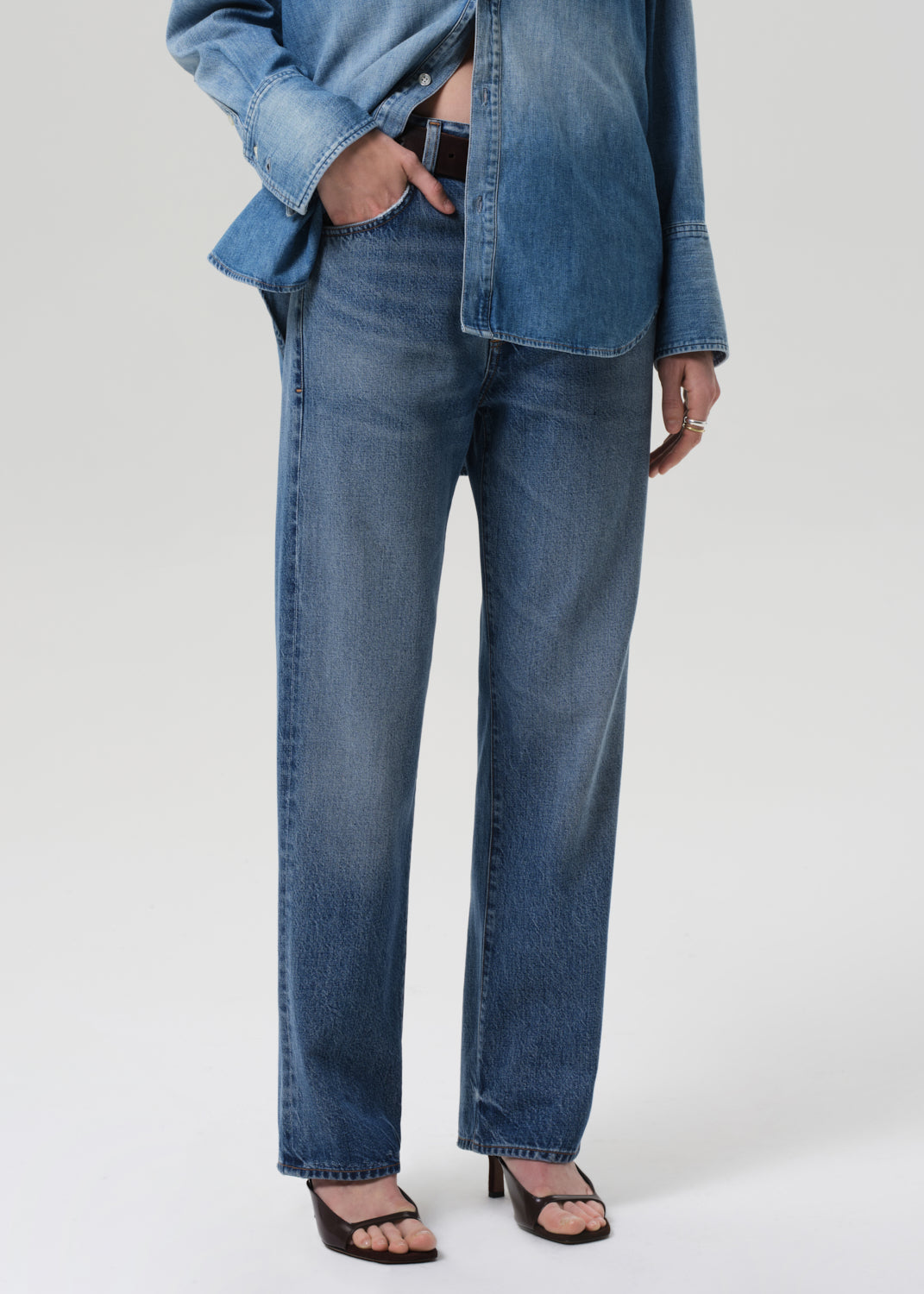 The ‘Baretta’ features a relaxed, straight-leg silhouette with a high rise and easy fit through the hip and thigh. The ‘Jete’ wash is a versatile medium indigo with soft fading and whiskering, crafted from a rigid blend of recycled cotton and lyocell for a broken-in feel from day one. Style with an oversized button-down or cropped jacket to play with proportion and balance.
