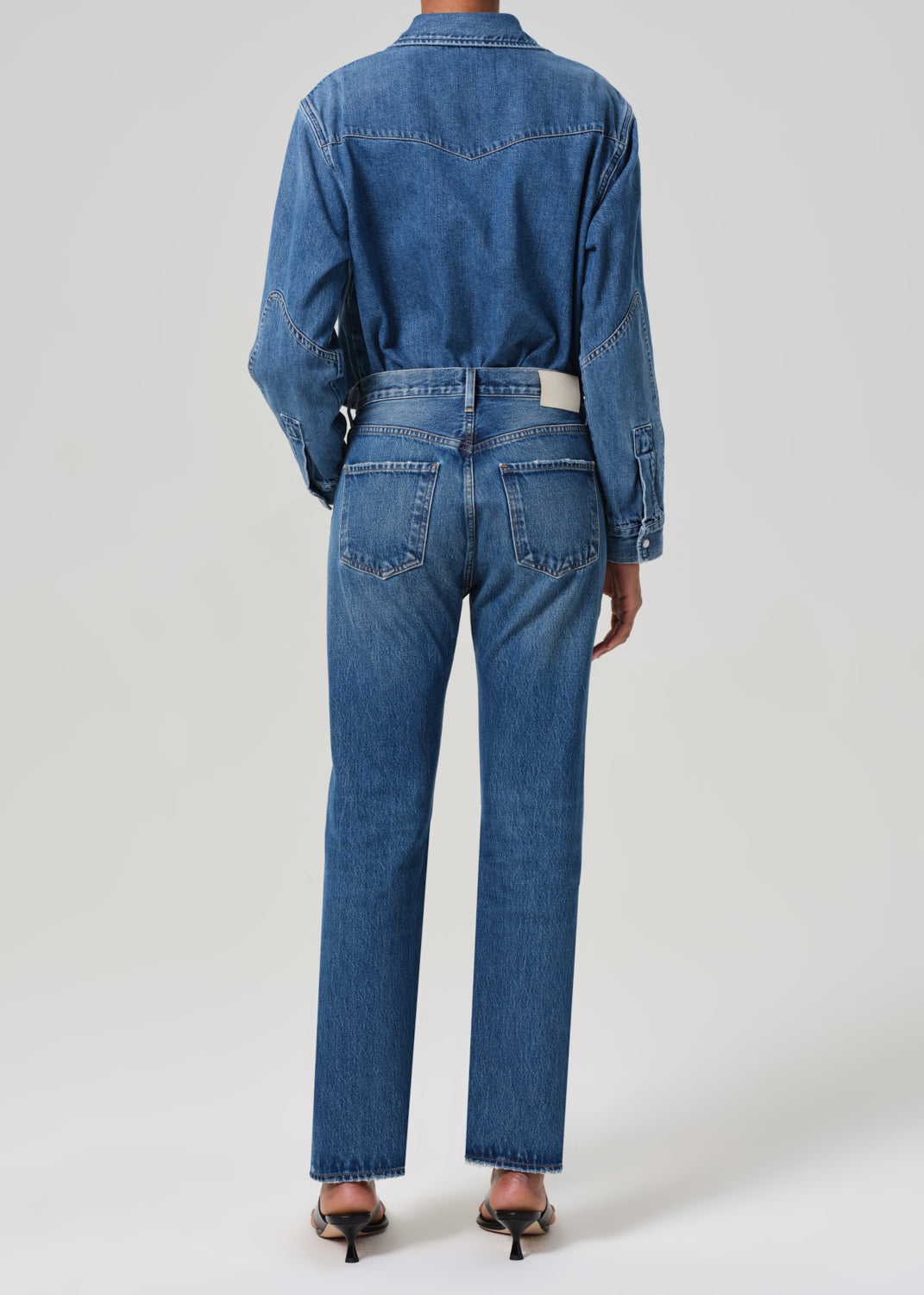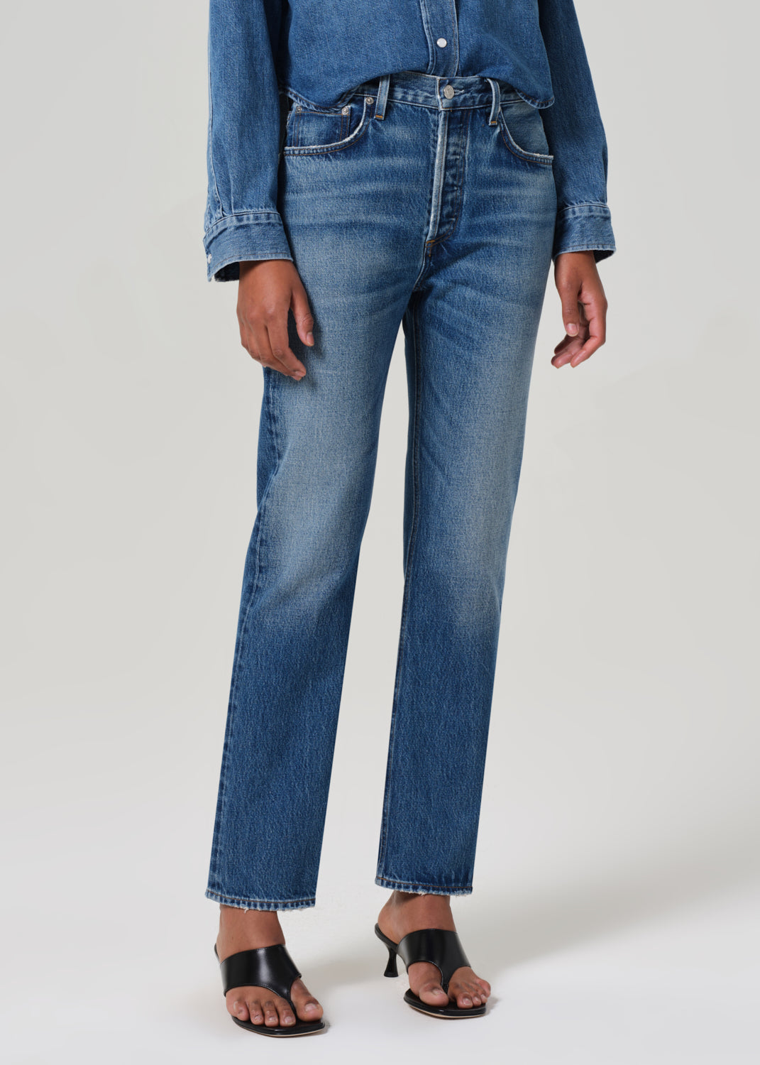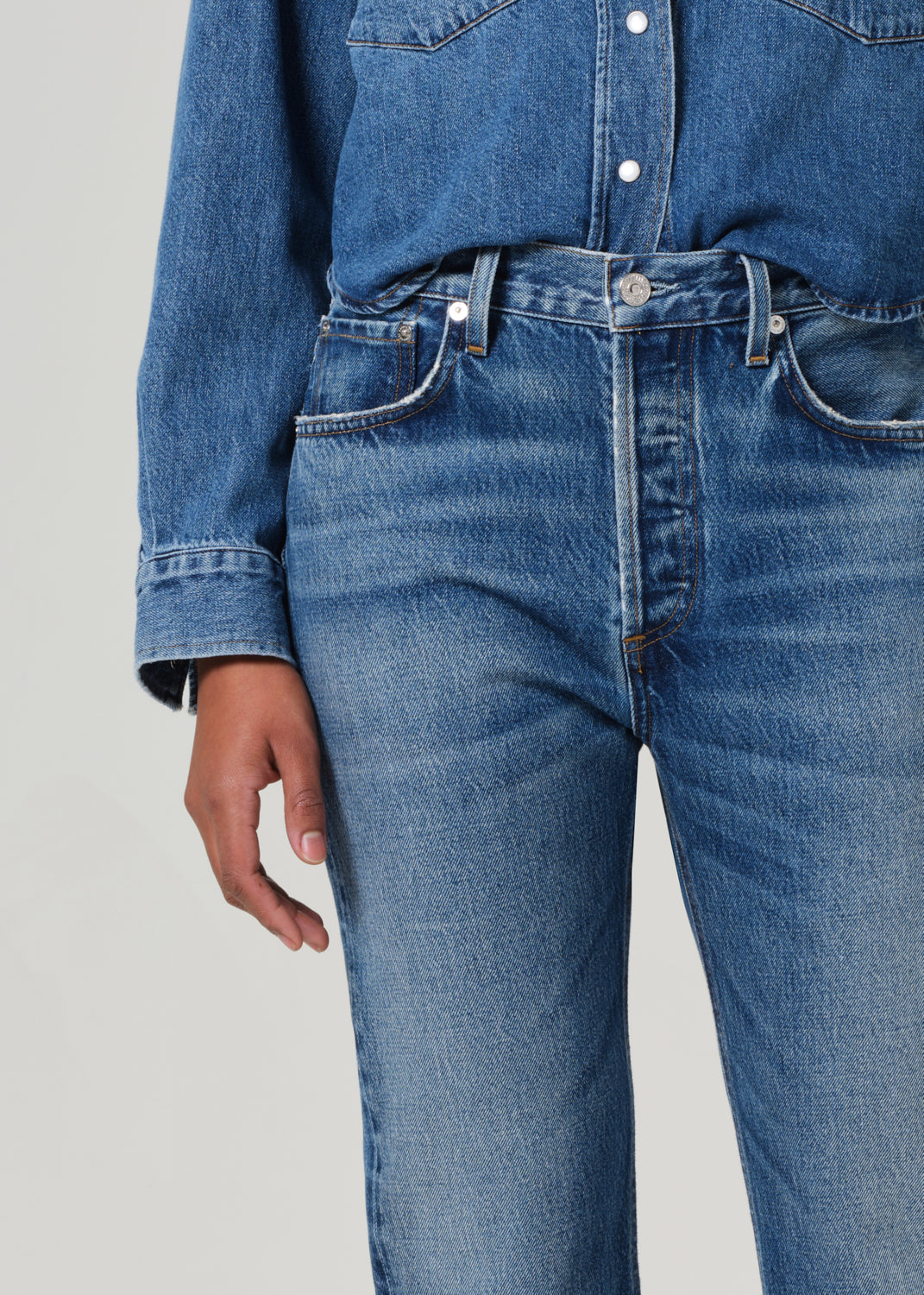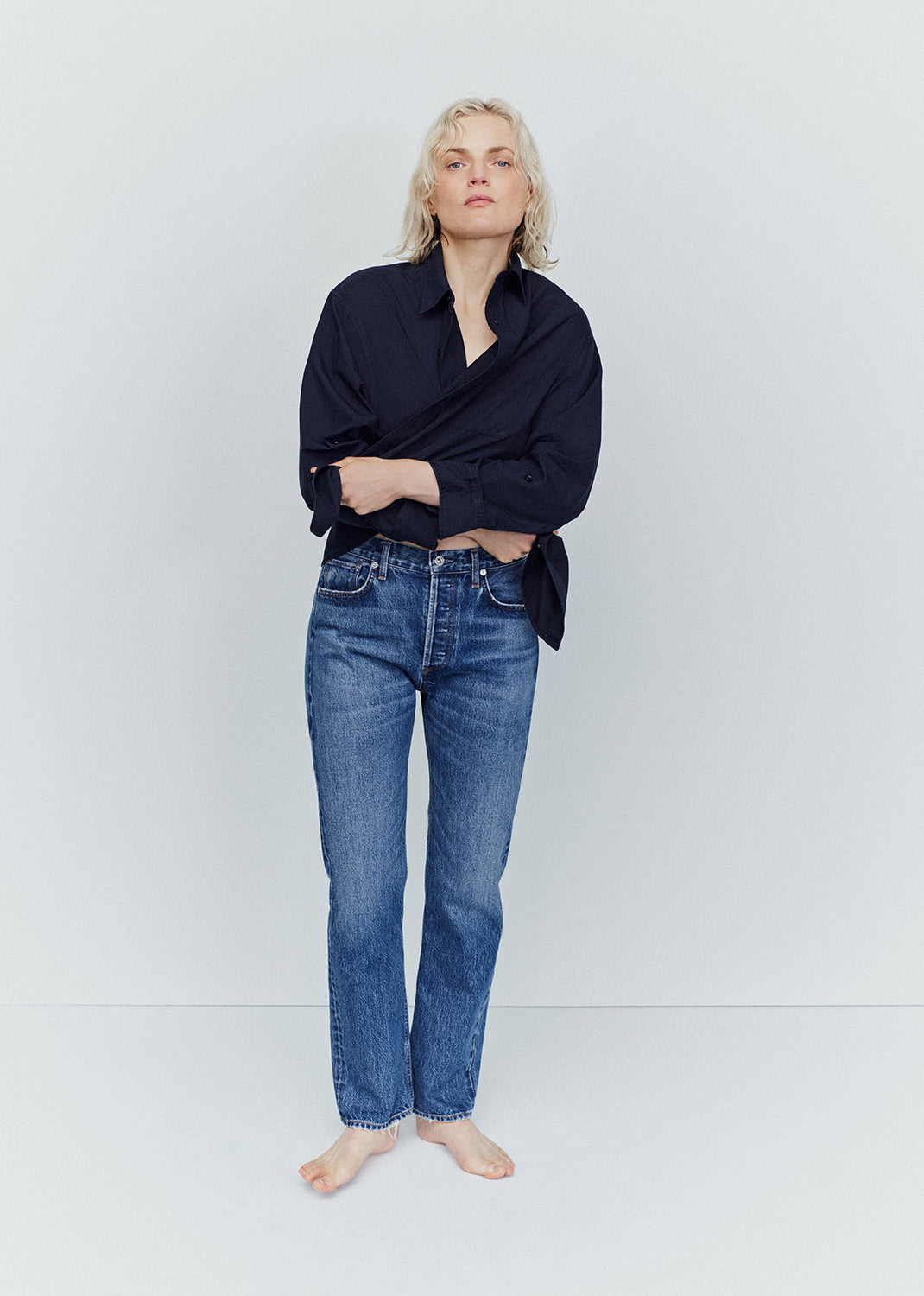 The ‘Blaine’ is a vintage-inspired straight leg with a high rise and ankle-length inseam for a flattering, clean-lined silhouette. The ‘Chaya’ wash is a softly worn medium-light indigo with subtle fading, marbling, and whiskering. Crafted from rigid regenerative cotton with a soft hand, it’s an everyday essential—style with a slim tee or oversized blazer for effortless contrast.