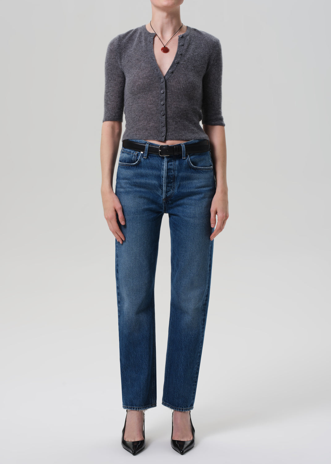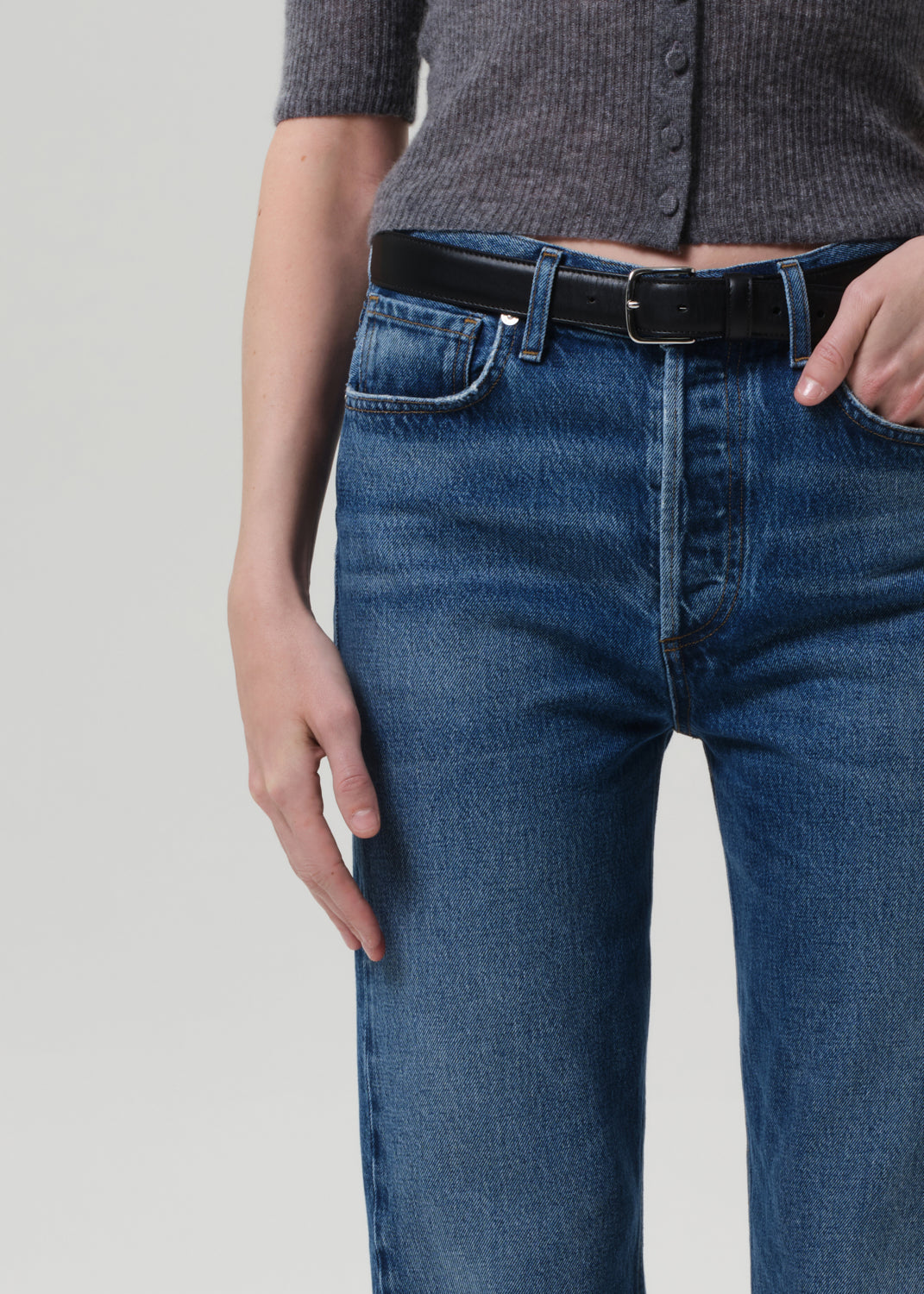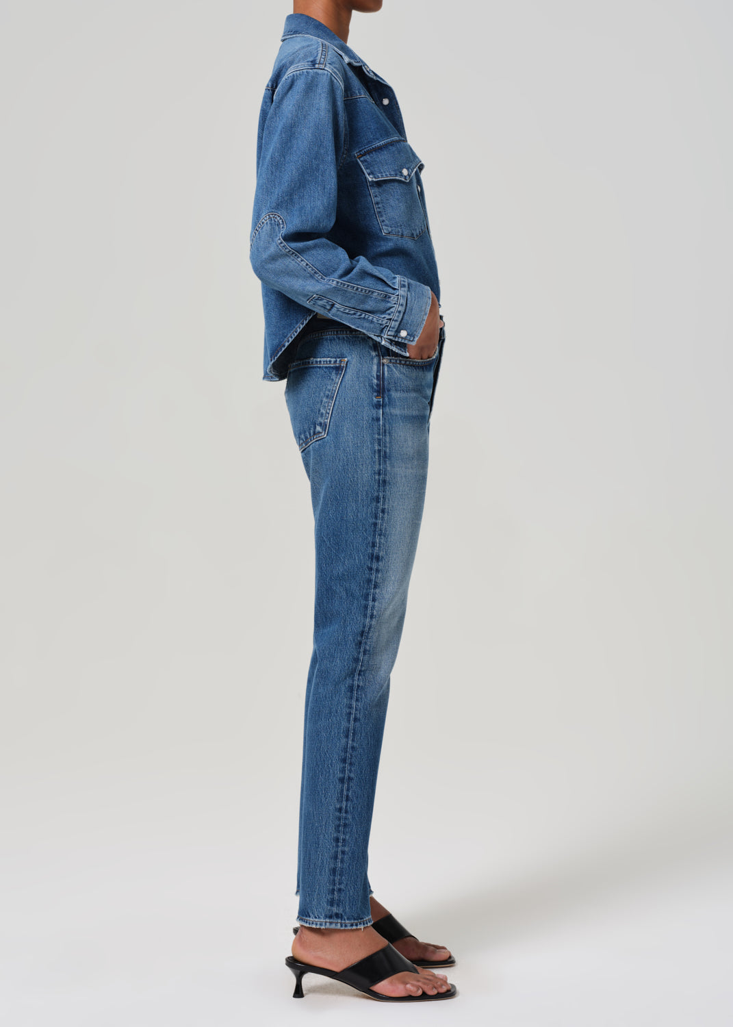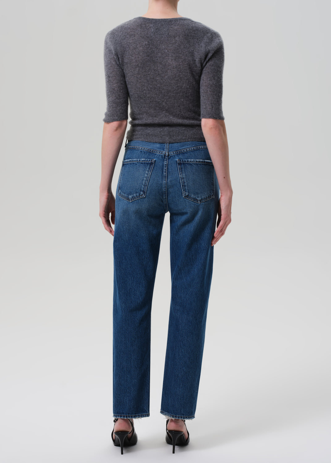 The ‘Blaine’ is a vintage-inspired straight leg with a high rise and ankle-length inseam for a flattering, clean-lined silhouette. The ‘Chaya’ wash is a softly worn medium-light indigo with subtle fading, marbling, and whiskering. Crafted from rigid regenerative cotton with a soft hand, it’s an everyday essential—style with a slim tee or oversized blazer for effortless contrast.