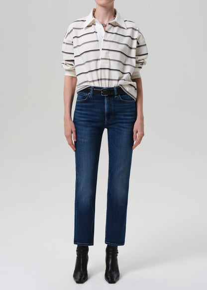 The Caia is a high-rise straight leg designed for everyday ease, crafted from soft stretch denim with a lightweight, flexible feel. The streamlined silhouette sits high on the waist and falls to an ankle-skimming length. The Ambry wash—a medium to dark indigo with soft fading and whiskering—offers a timeless, worn-in look. Perfect paired with crisp shirting or easy knits.