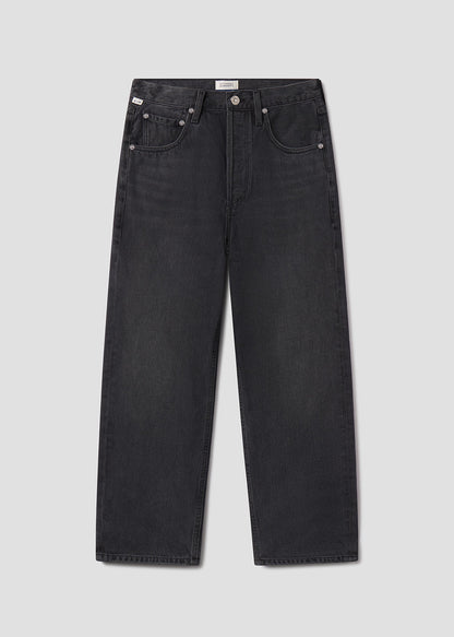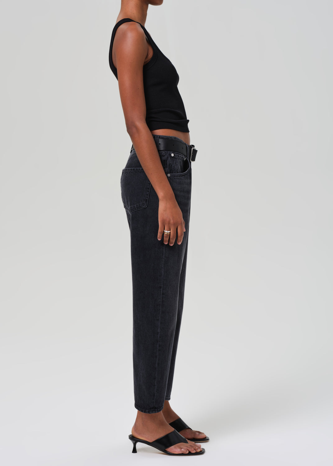 The ‘Dahlia Baby Roll’ is a relaxed tapered jean crafted from rigid regenerative cotton denim with a soft, broken-in hand. Designed with a button fly and optional cuff, it balances ease with intention. The Stonington wash—a dark, washed black with subtle fading and marbling—offers a cool, lived-in edge. Wear it cuffed with low-top sneakers or long with sleek ankle boots.