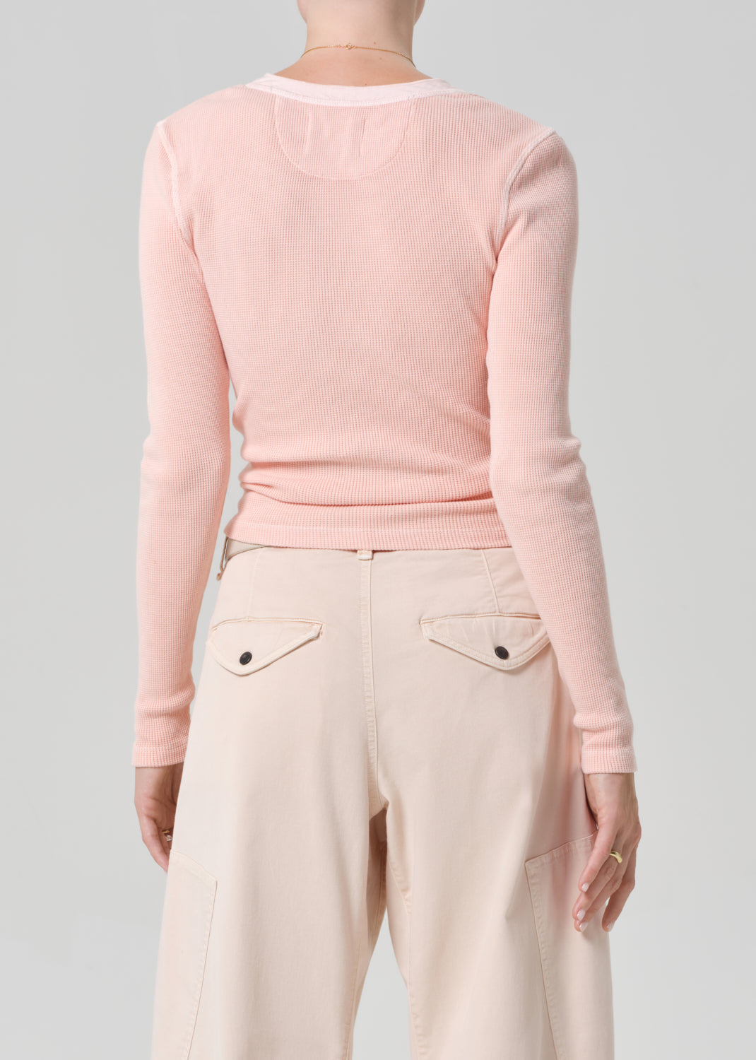 The Drea is a refined henley crafted from ultra-soft regenerative cotton in a textured waffle rib. Designed with a close fit and subtle neckline detailing, it offers supportive stretch and effortless versatility—perfect on its own or layered under your favorite pieces.
