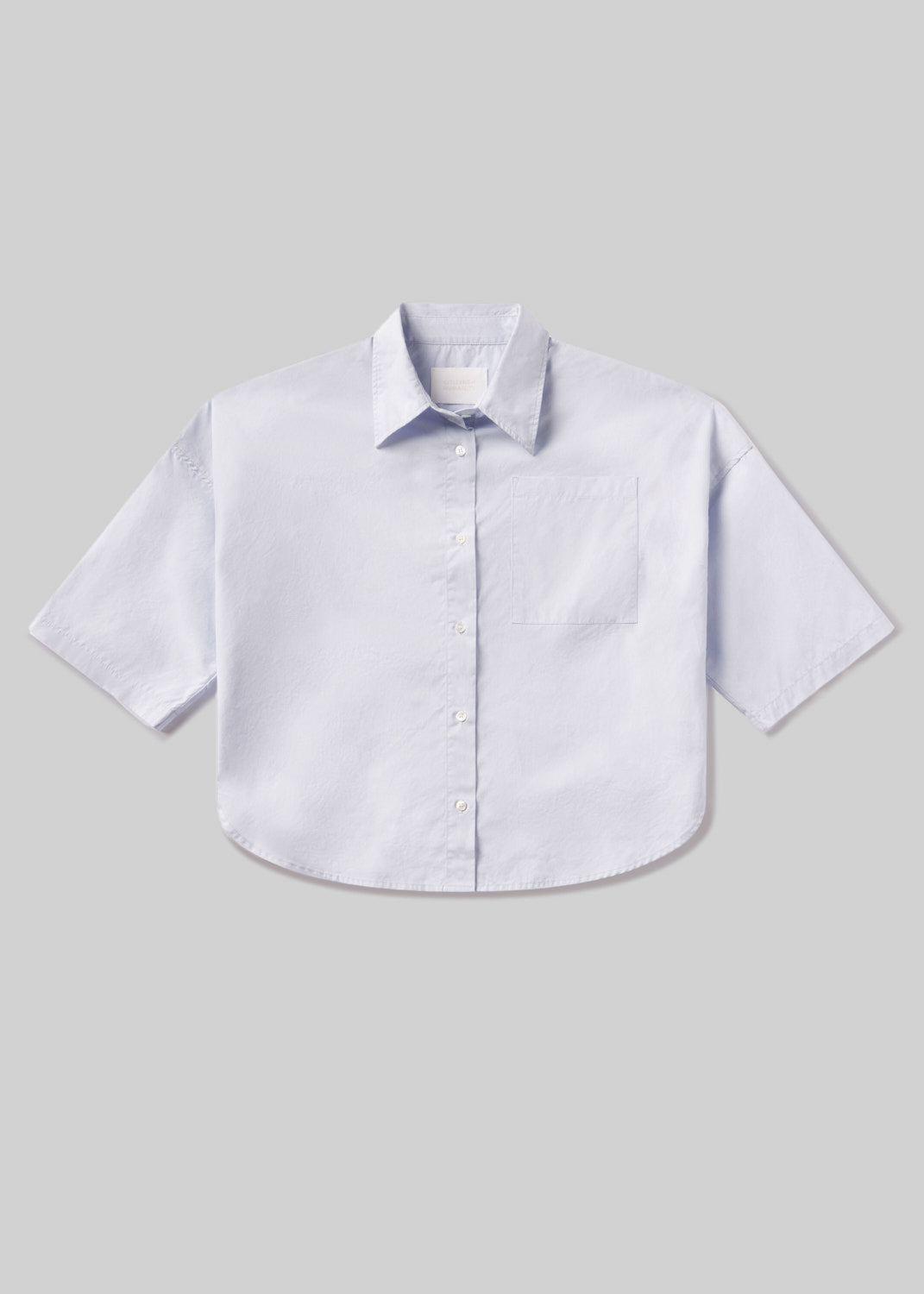 The ‘Frances’ is a fresh take on the classic button-up, crafted from ultra-lightweight cotton poplin with an airy, breathable feel. Designed with a cropped silhouette and subtle cape-inspired back detail, it blends structure with softness. Style it with high-rise denim or tailored shorts for a modern, effortless look.