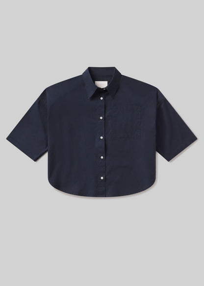 Looks Like: Dark navy cropped short sleeve button up shirt