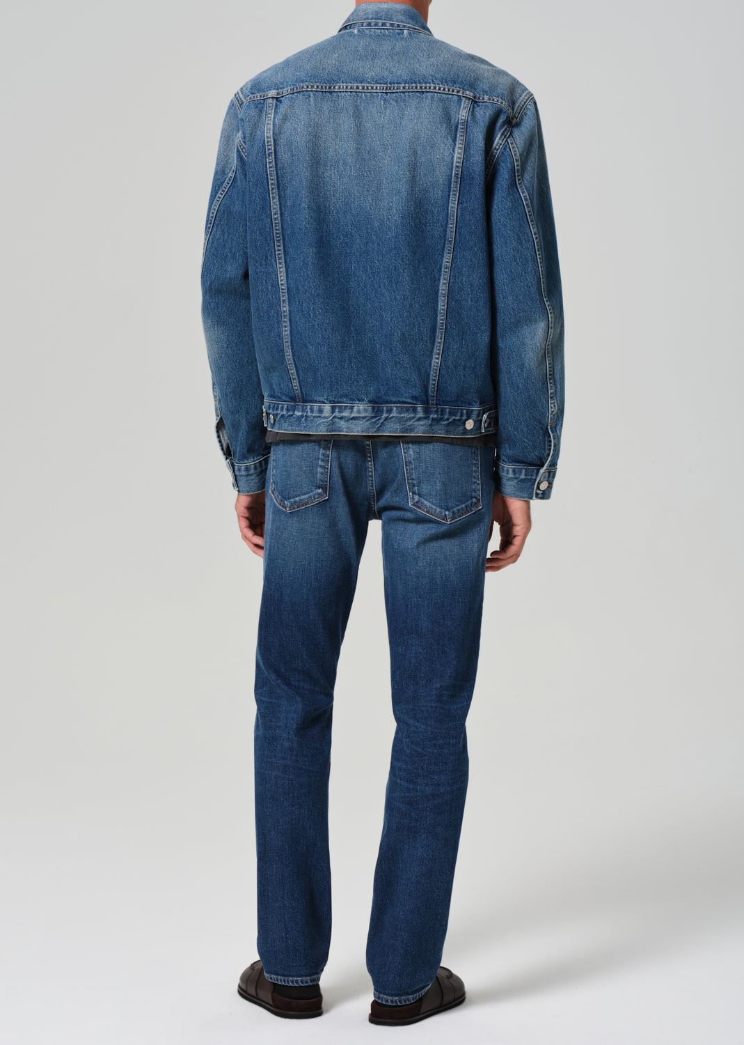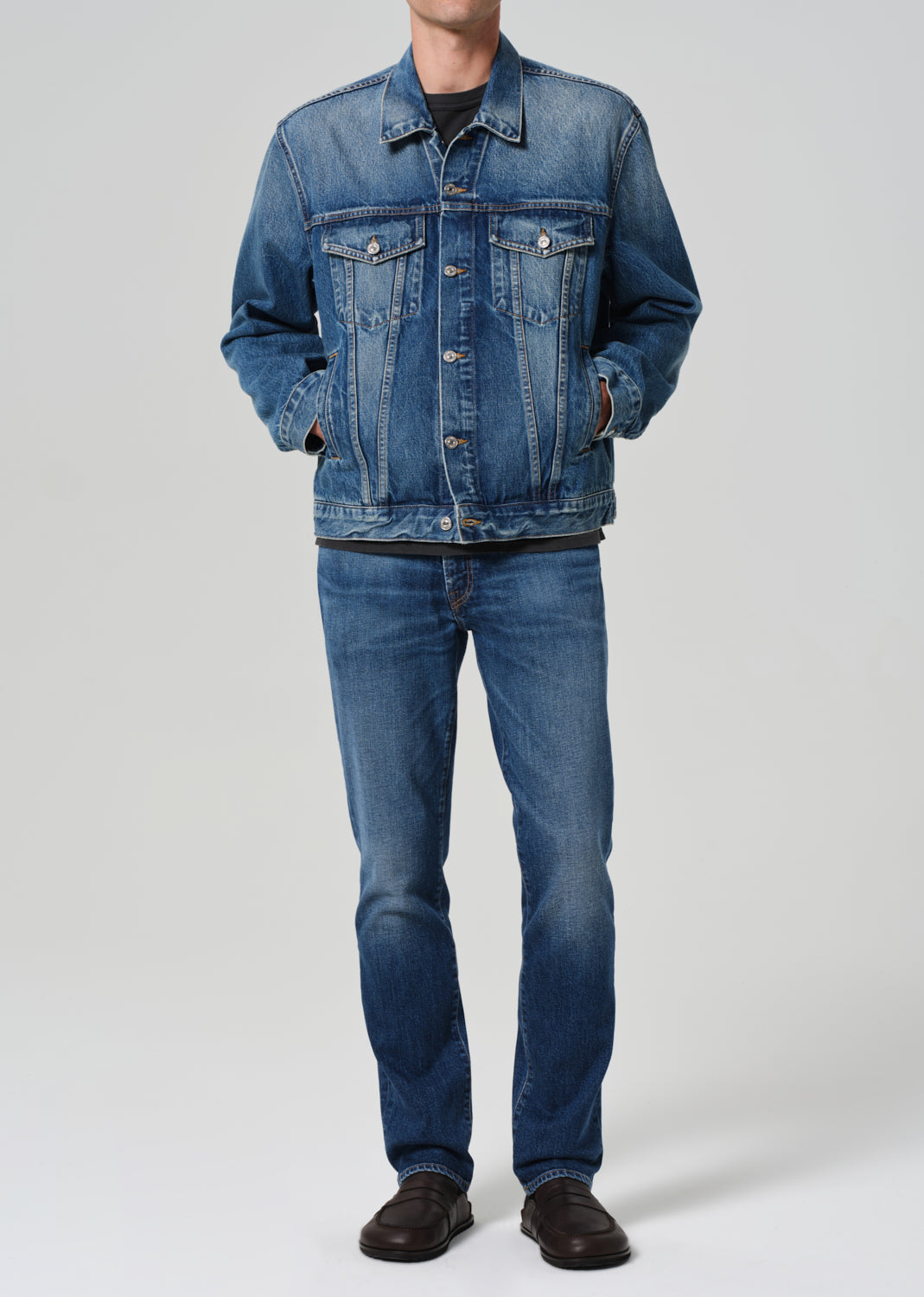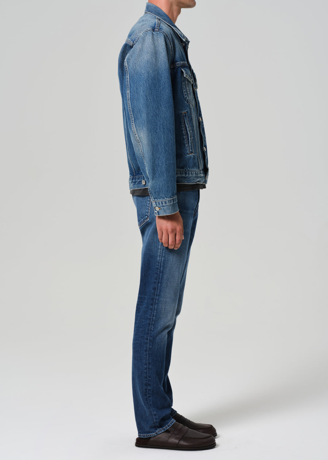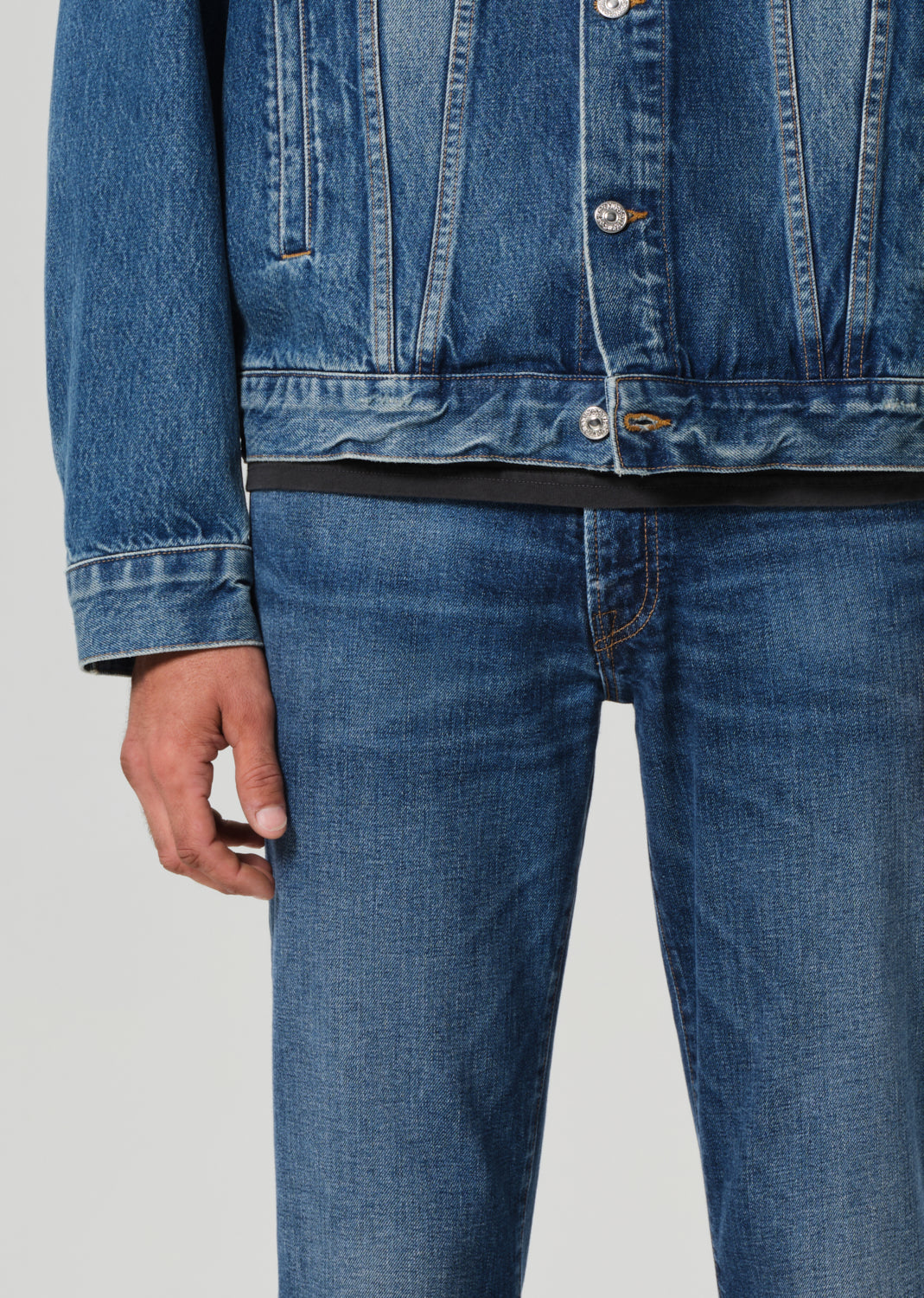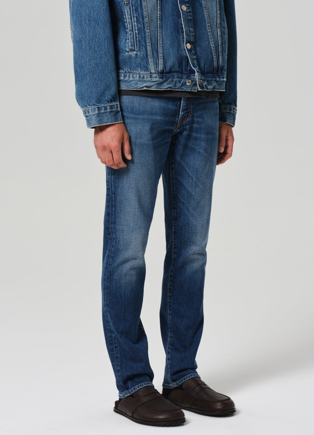 The Gage is our tapered classic, designed with a relaxed fit through the hip and thigh and a clean, straight finish. Crafted from comfort stretch archive denim, it offers structure with a soft hand for all-day ease. Roscoe is a medium indigo wash with marbling, fading, and whiskering for a broken-in look that’s both versatile and refined.