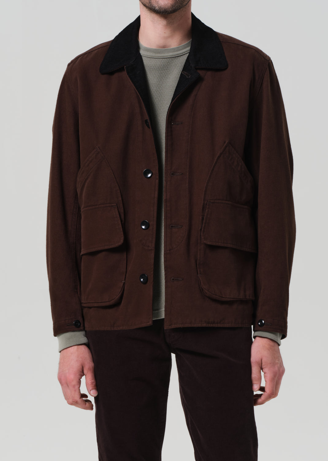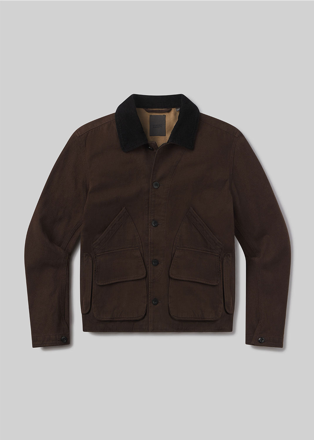 Looks Like: Clean dark brown jacket with front pocket detailing & accented collar