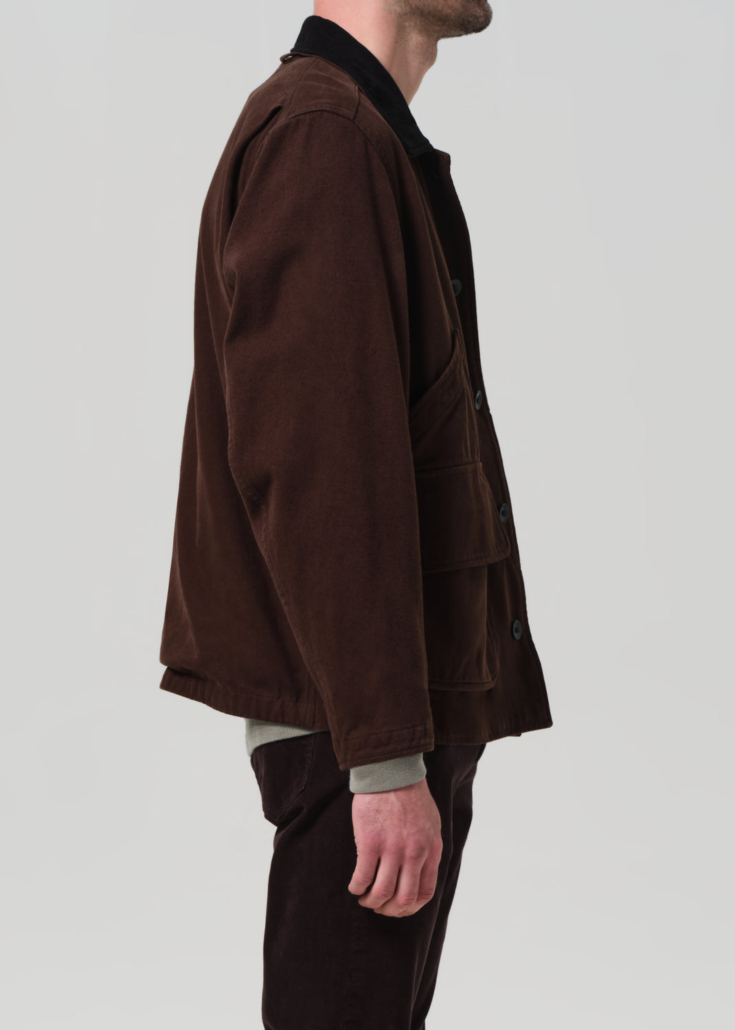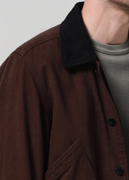 The ‘Hunter’ Jacket is a utilitarian staple reimagined in midweight brushed twill with a durable yet refined finish. Designed with classic pocket detailing and an accented collar, it balances structure with ease. The deep brown hue adds a grounded sophistication—ideal layered over denim or casual tailoring.