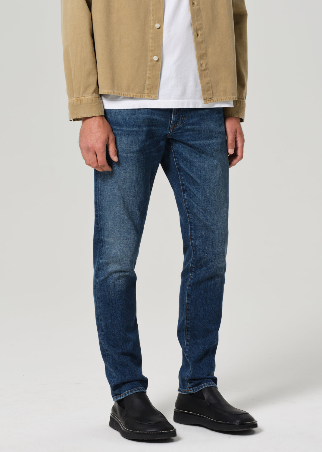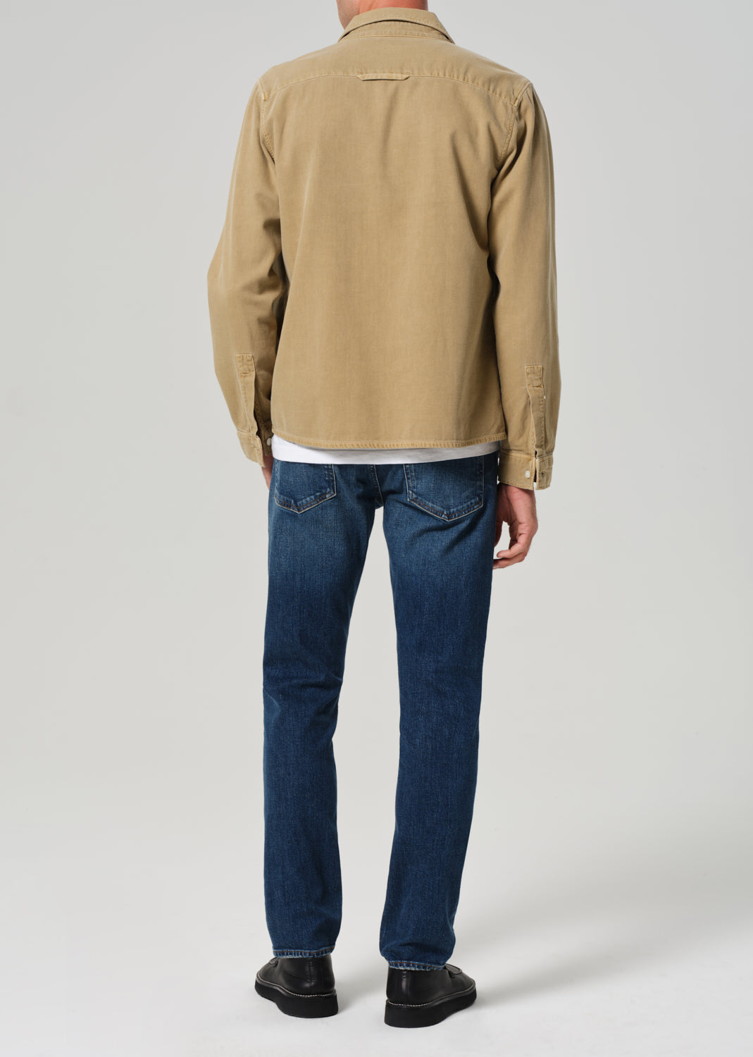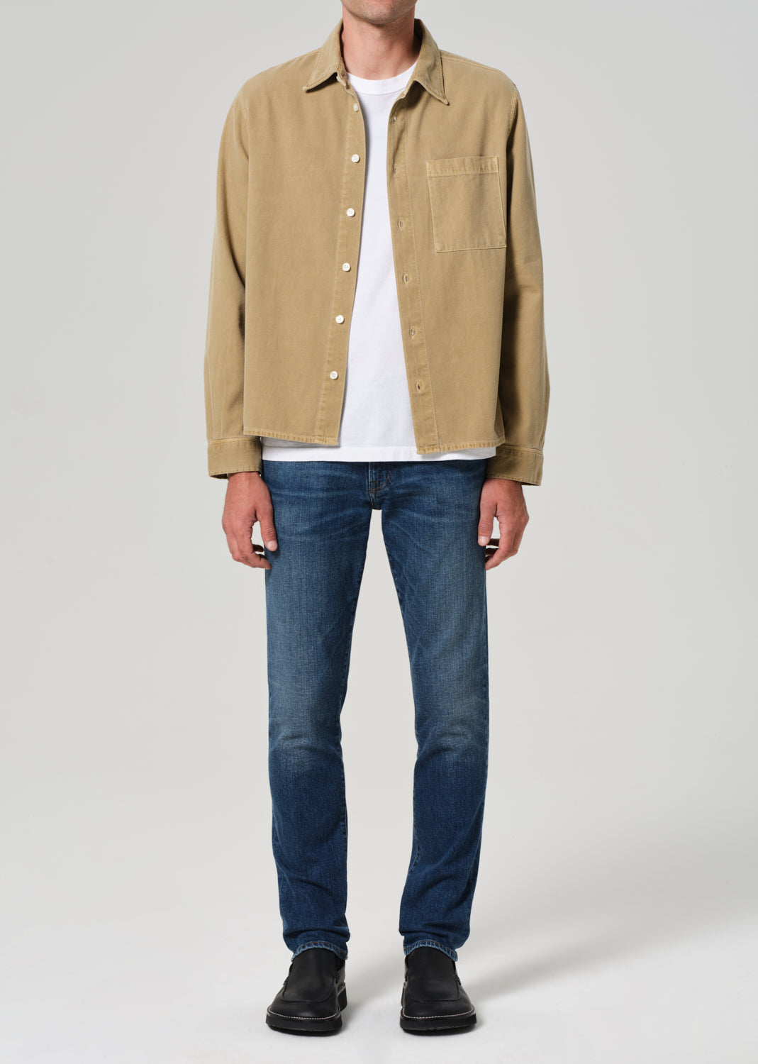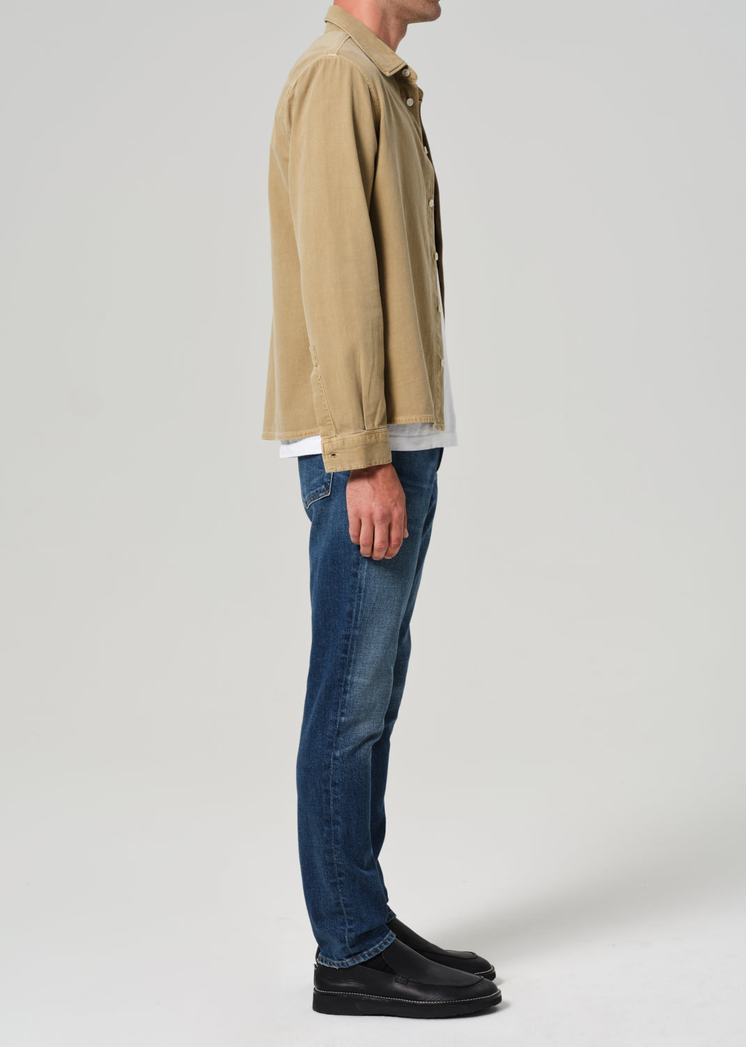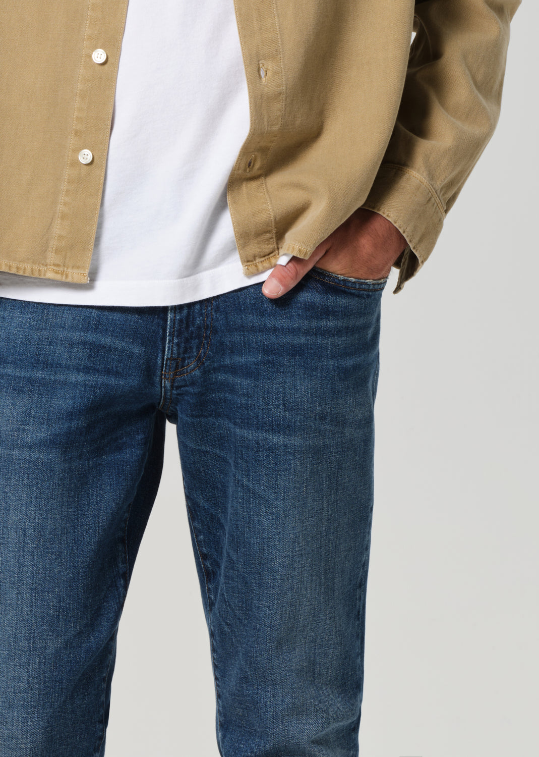 The ‘London’ is a modern slim taper, designed to sit clean through the thigh and narrow below the knee for a tailored silhouette. Cut from regenerative stretch denim with a soft hand, it balances structure with ease. Parquet is a medium-dark indigo wash with subtle marbling and whiskering—ideal for everyday wear.