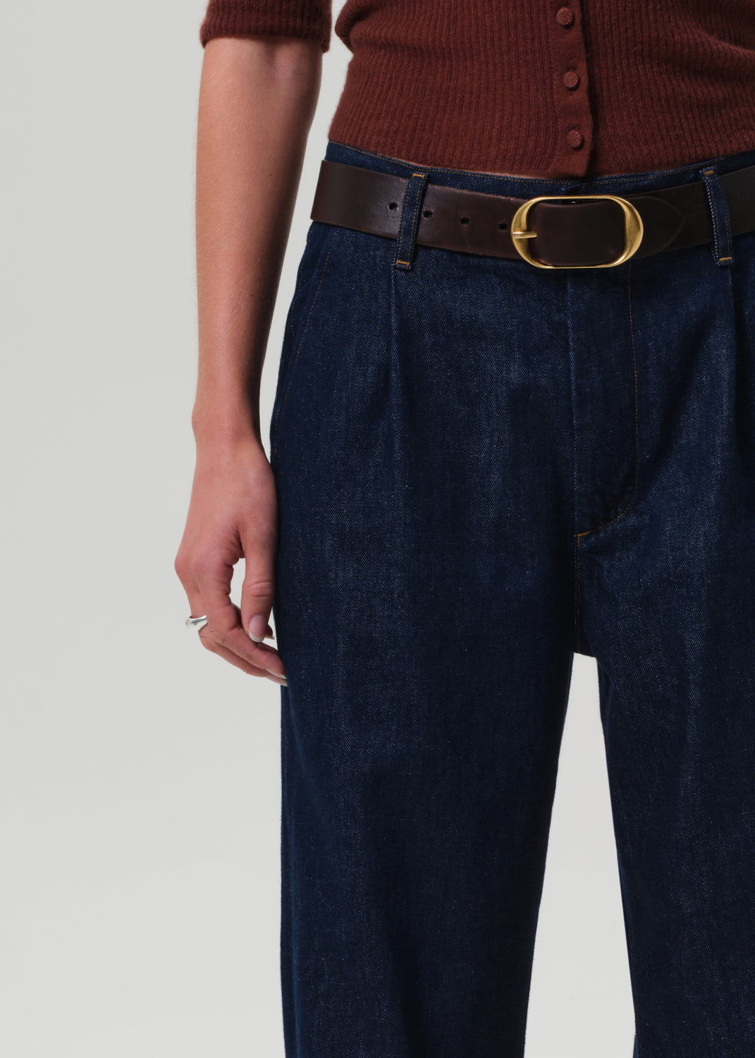 The Mallory Trouser is a refined wardrobe staple, cut from weightless non-stretch denim with a washed-down, ultra-soft feel. Designed with a high rise, straight leg, and front pleat detailing, it offers a clean, elongating silhouette. Dark rinsed indigo adds a polished denim twist—style with anything from sneakers to sleek heels.