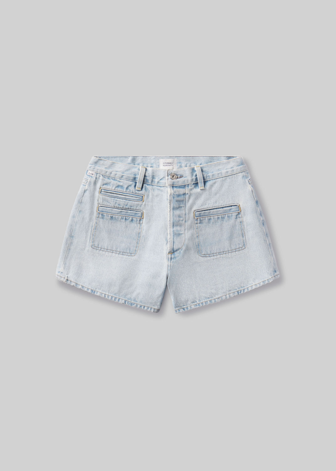 Looks Like: Light indigo denim short with marbling and welt pocket detailing