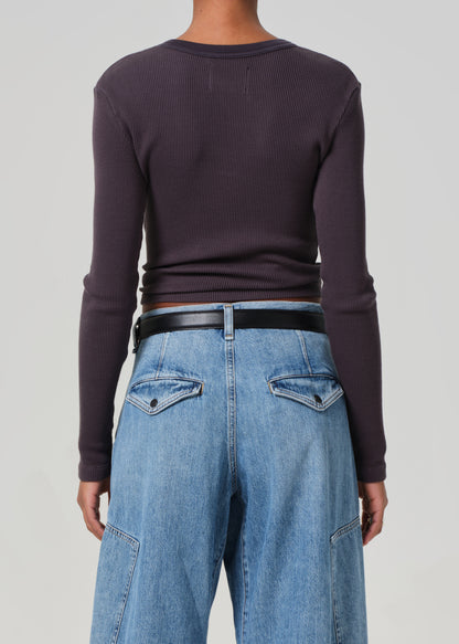 Looks Like: Dark charcoal fitted long sleeve shirt