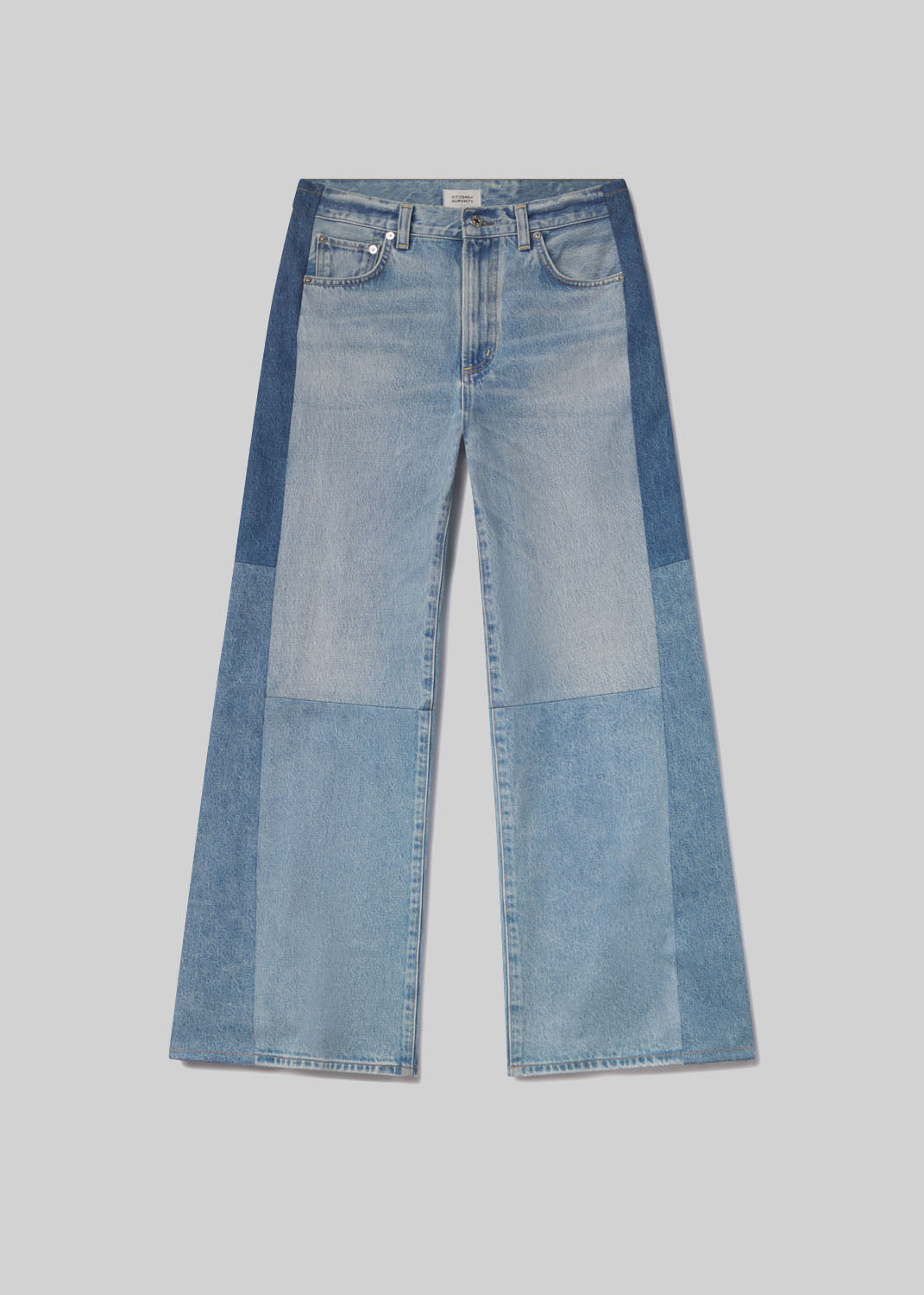 Looks Like: Light to medium indigo reworked paneled denim
