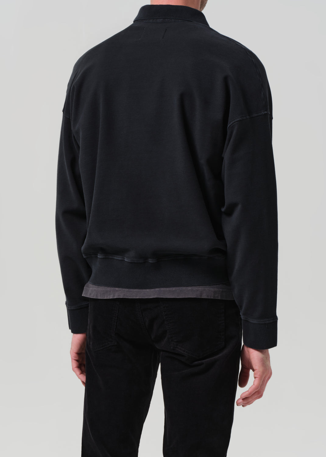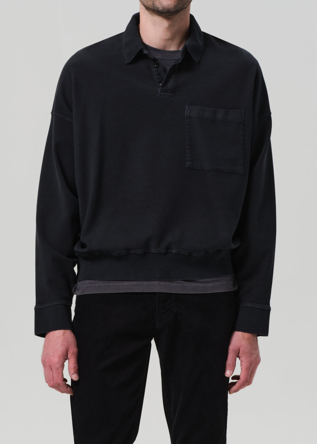 Looks Like: Dark charcoal grey long sleeve polo with front pocket