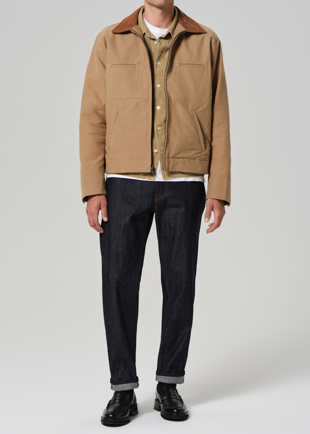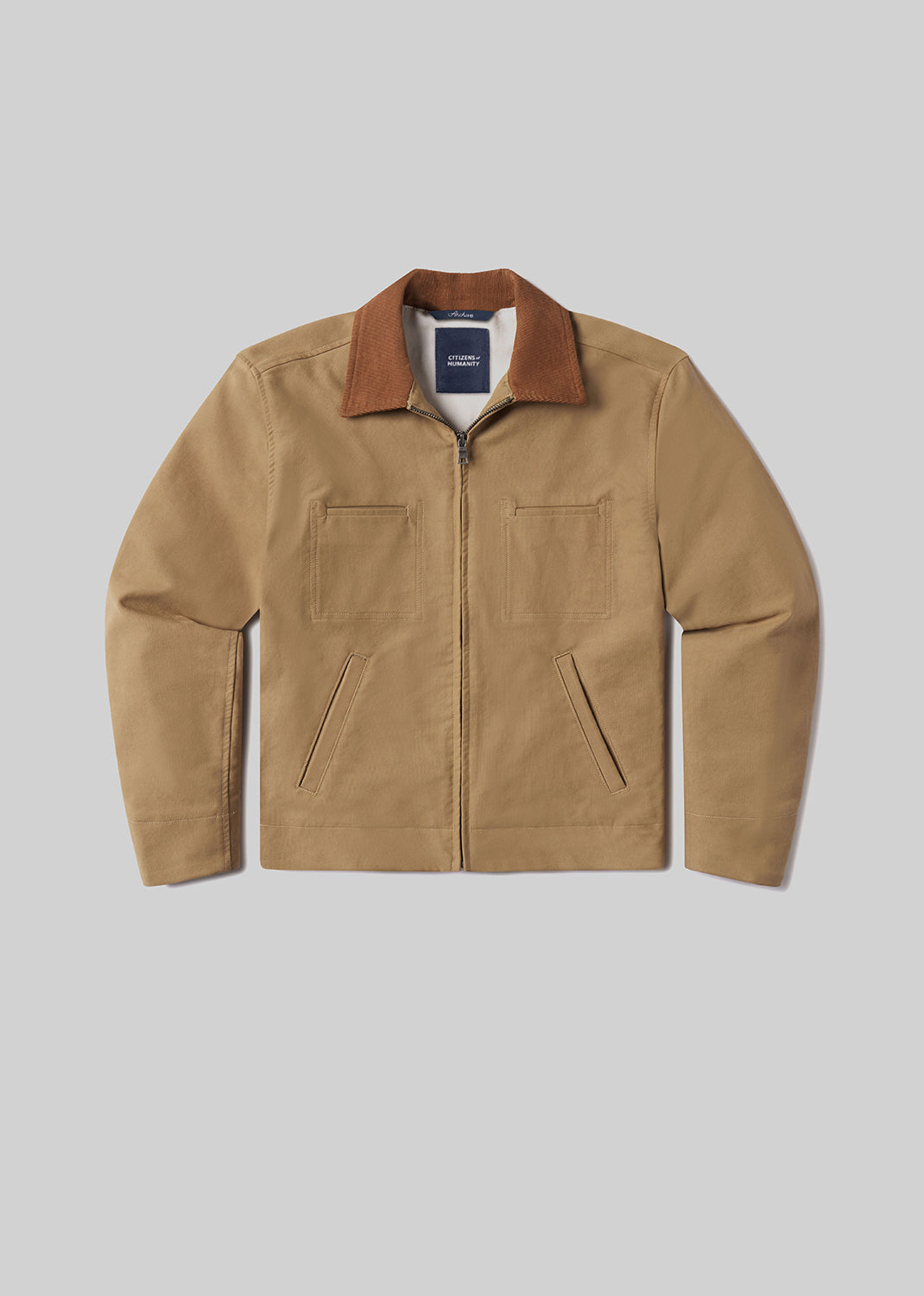 Meticulously hand-sanded and distinguished by its stylish corduroy collar and sophisticated shape, this piece features on-seam pockets for added functionality and timeless appeal.