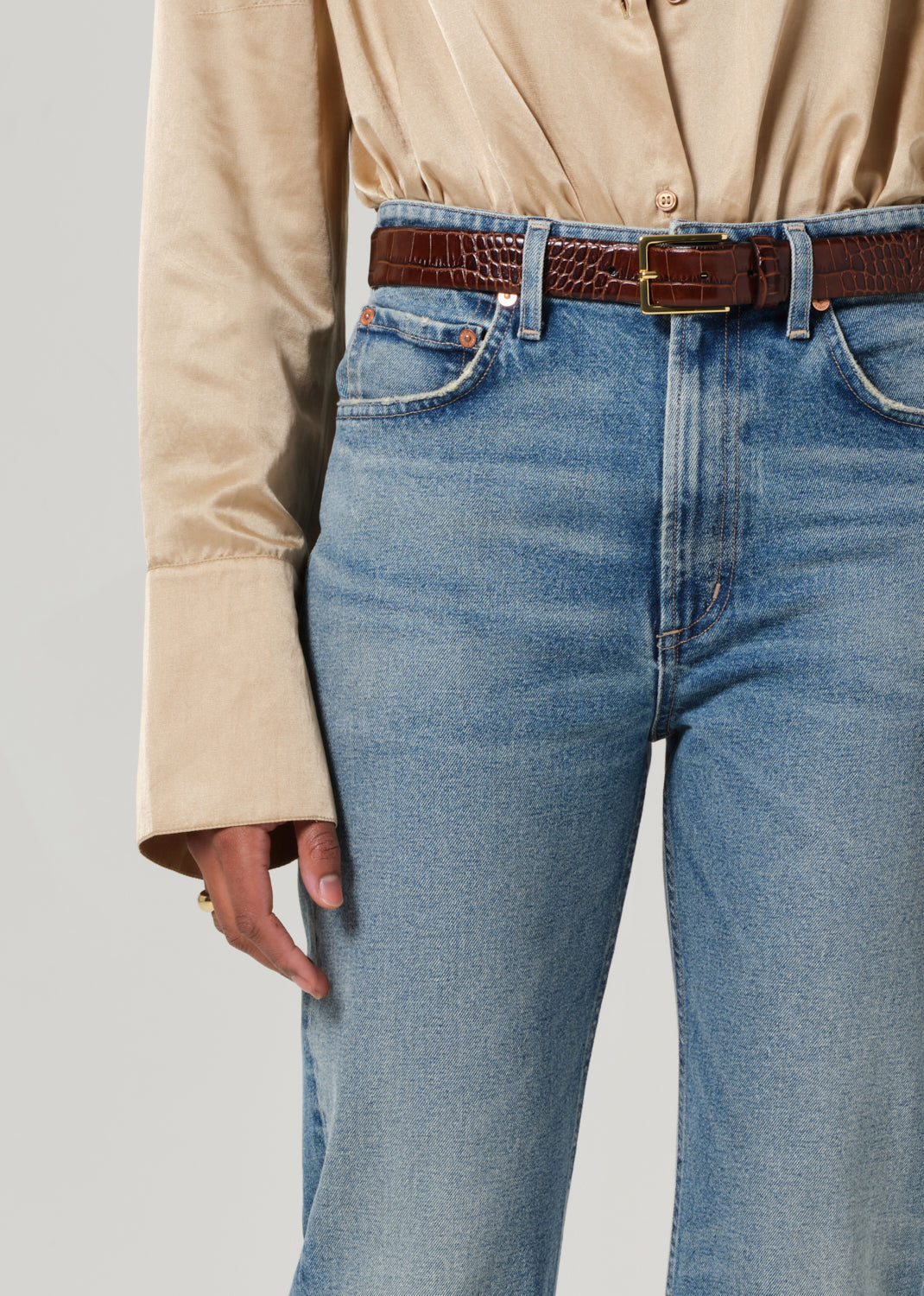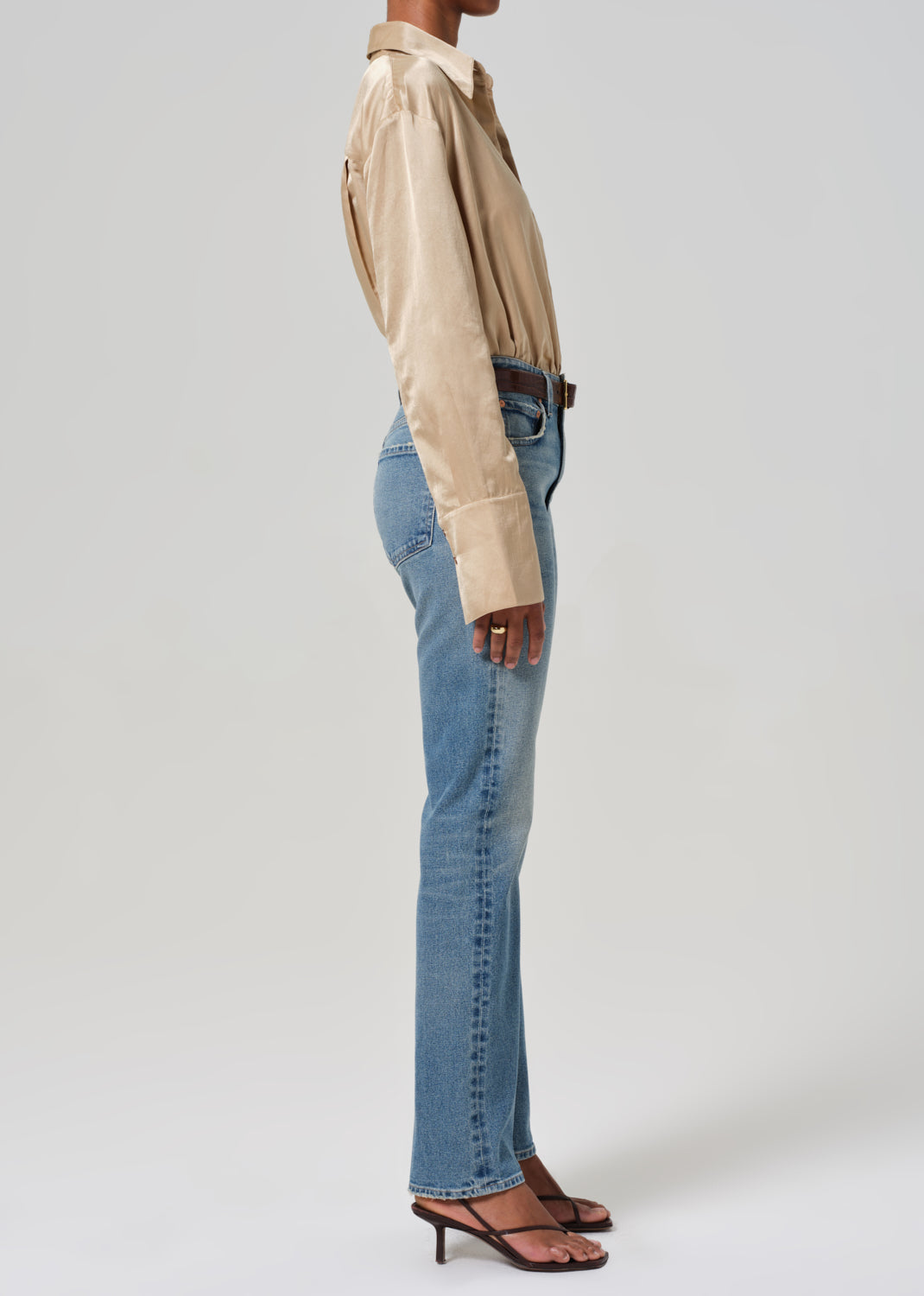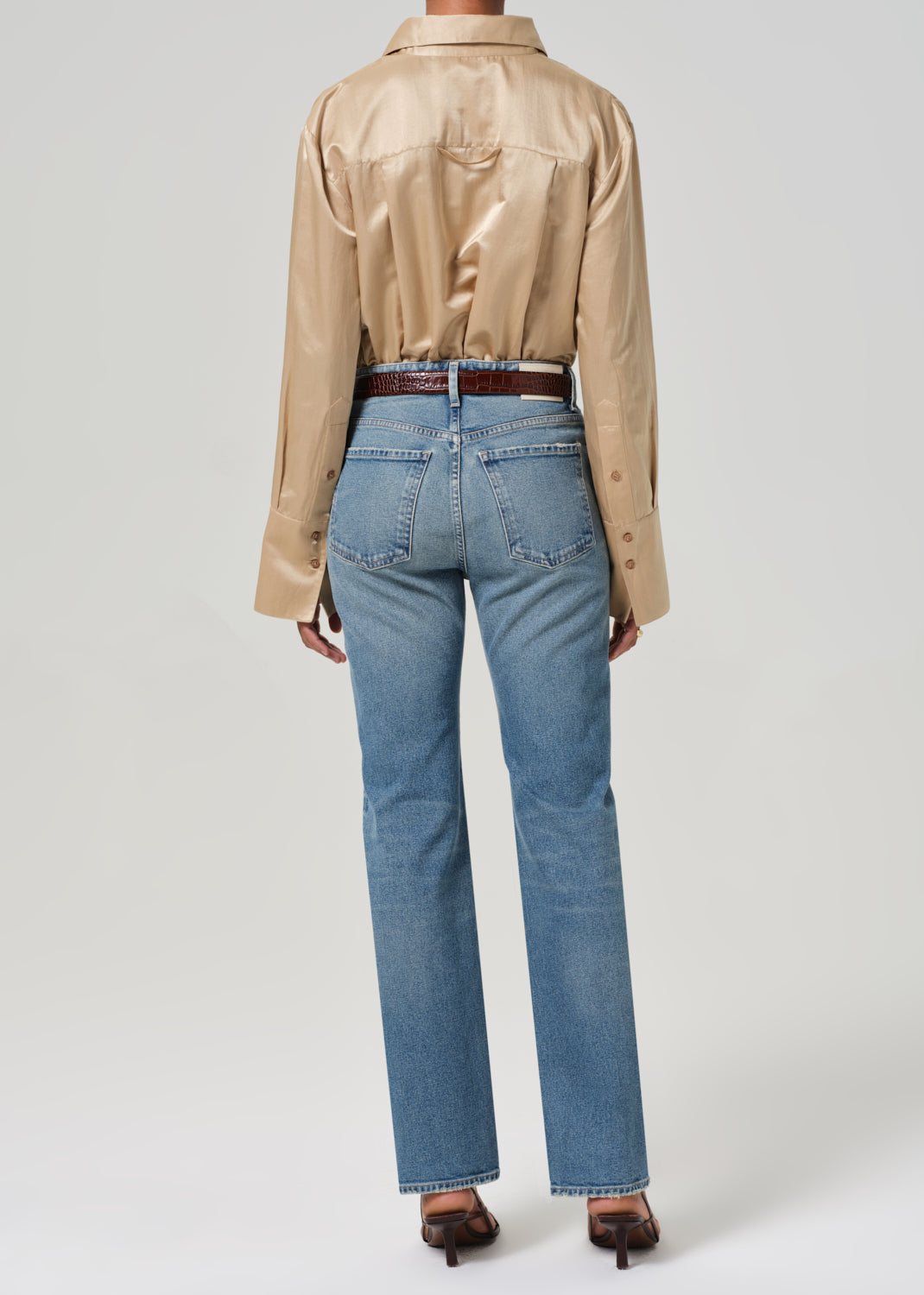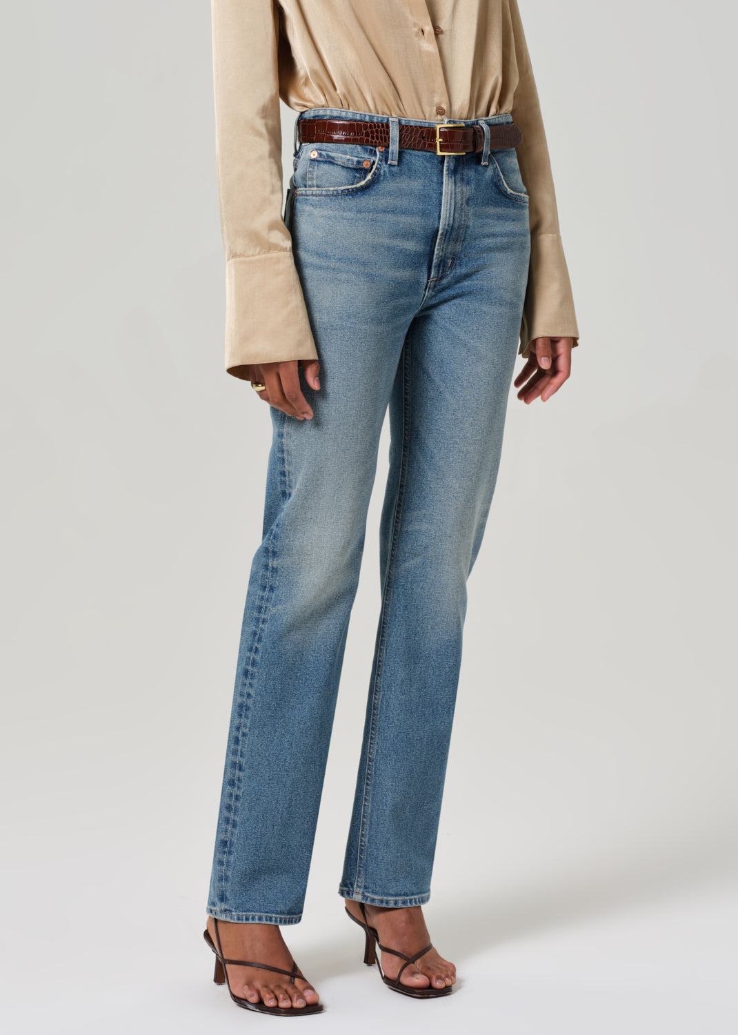 The Zurie is a high-rise straight leg that offers timeless structure with just the right amount of ease. Cut from Japanese comfort stretch denim, it has a soft yet supportive feel that holds its shape. The medium indigo wash lends a vintage note—pair it with a relaxed tee or polished knit for effortless styling.